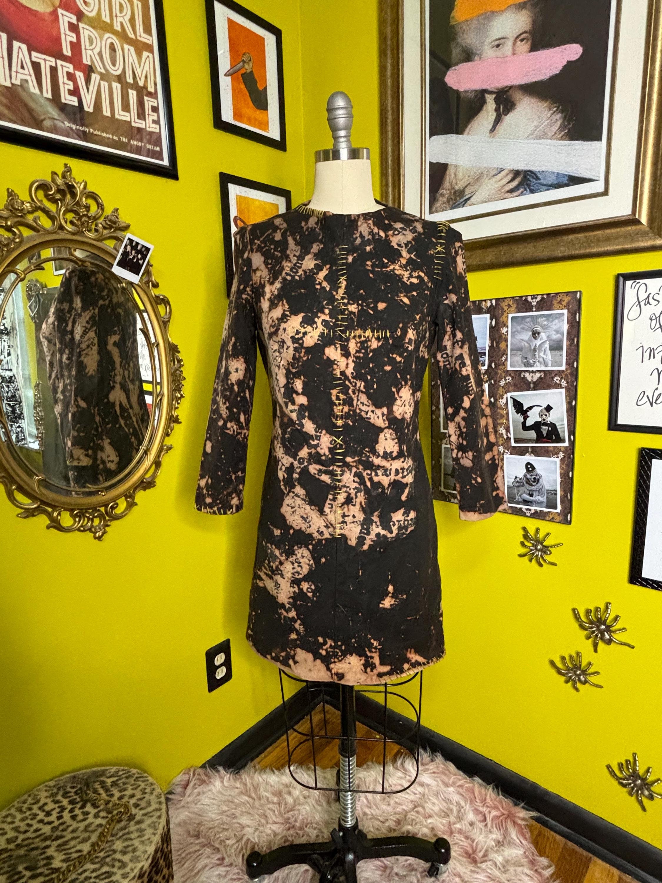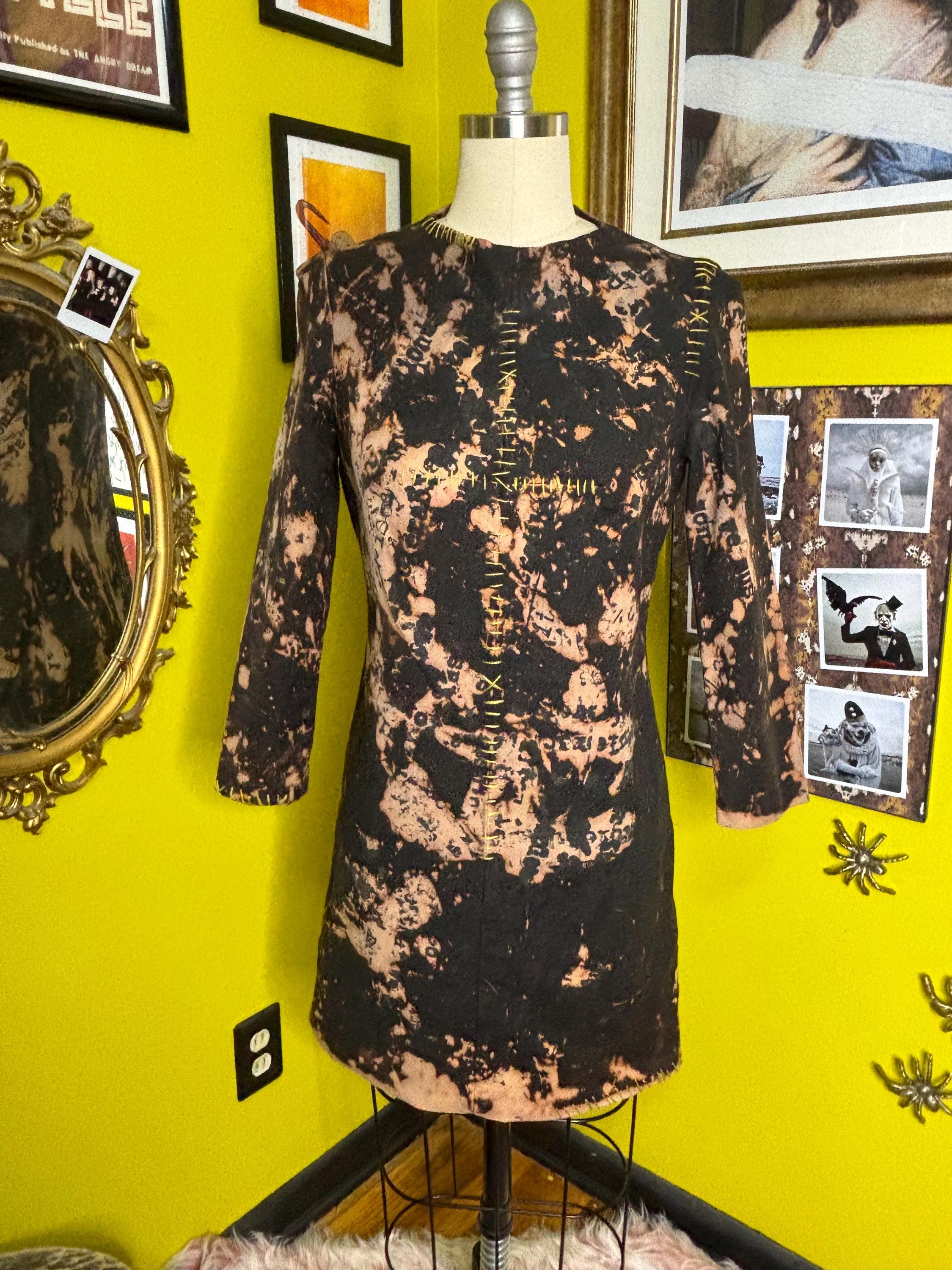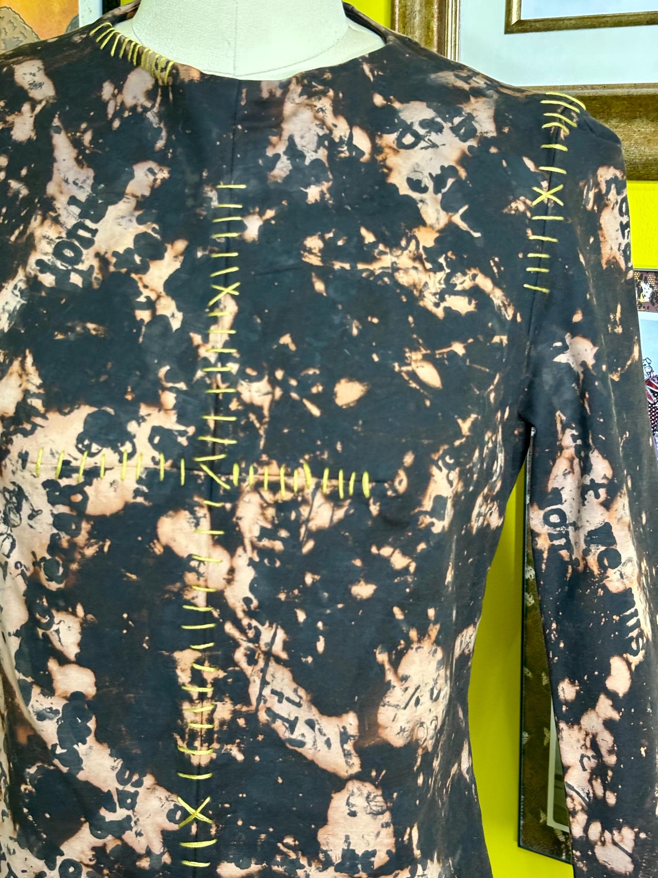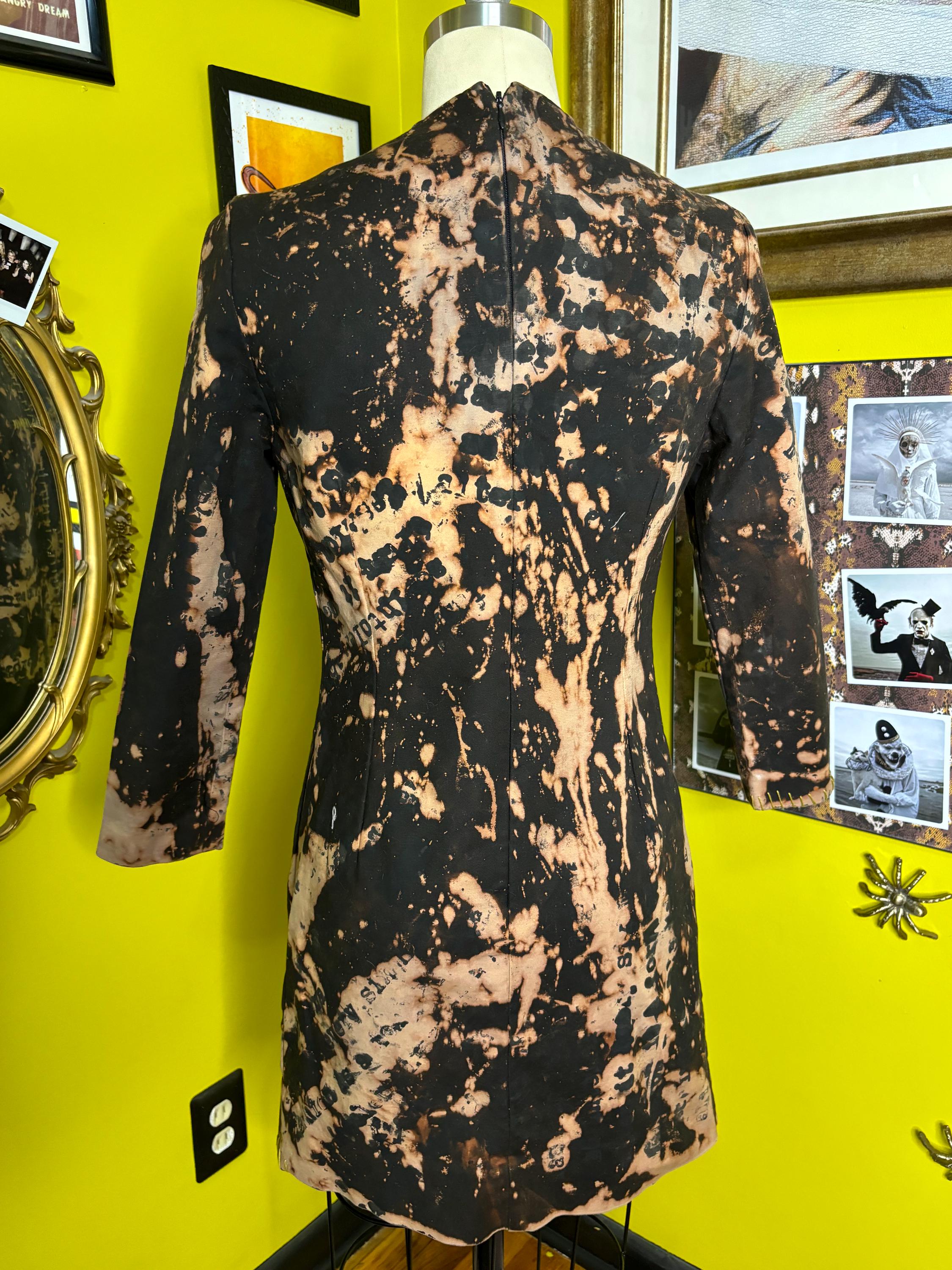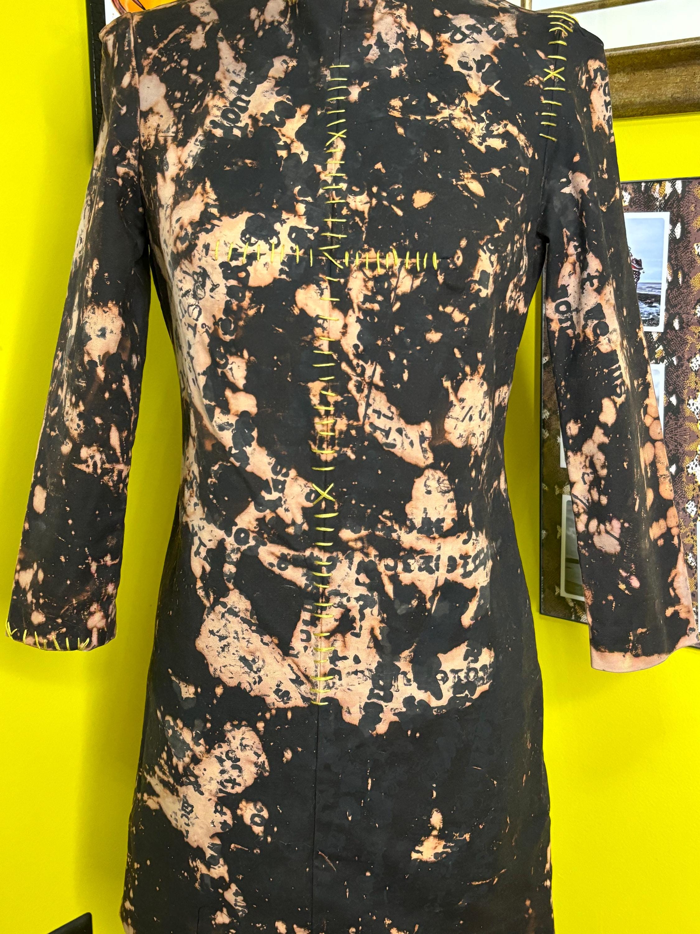 Structured, mediumweight black dress dipped in an acid bath and handprinted with distressed "anti fashion" quotes. Top stitched with pukey, chartreuse green yarn. Dress has stretch and a zip back closure.