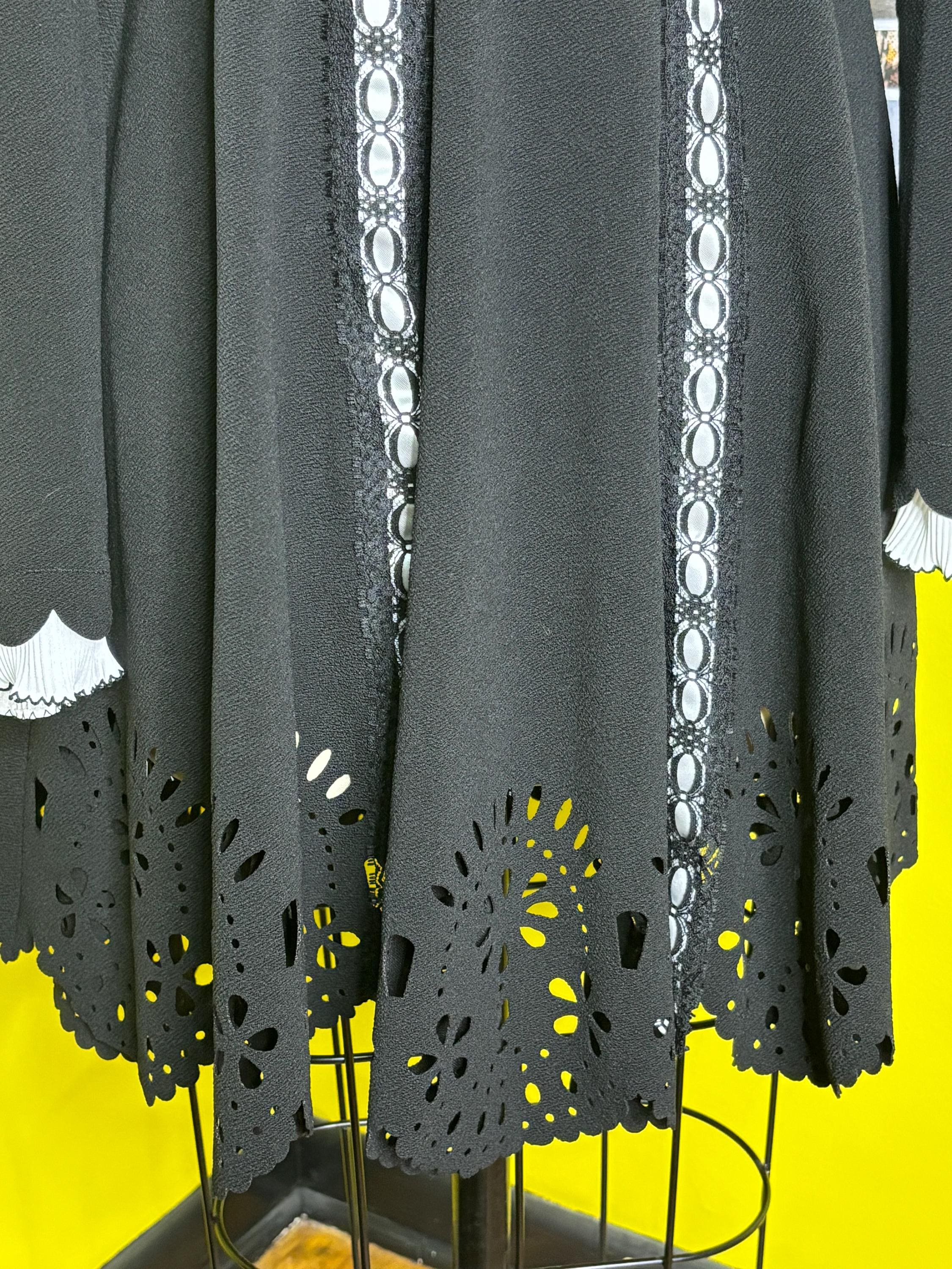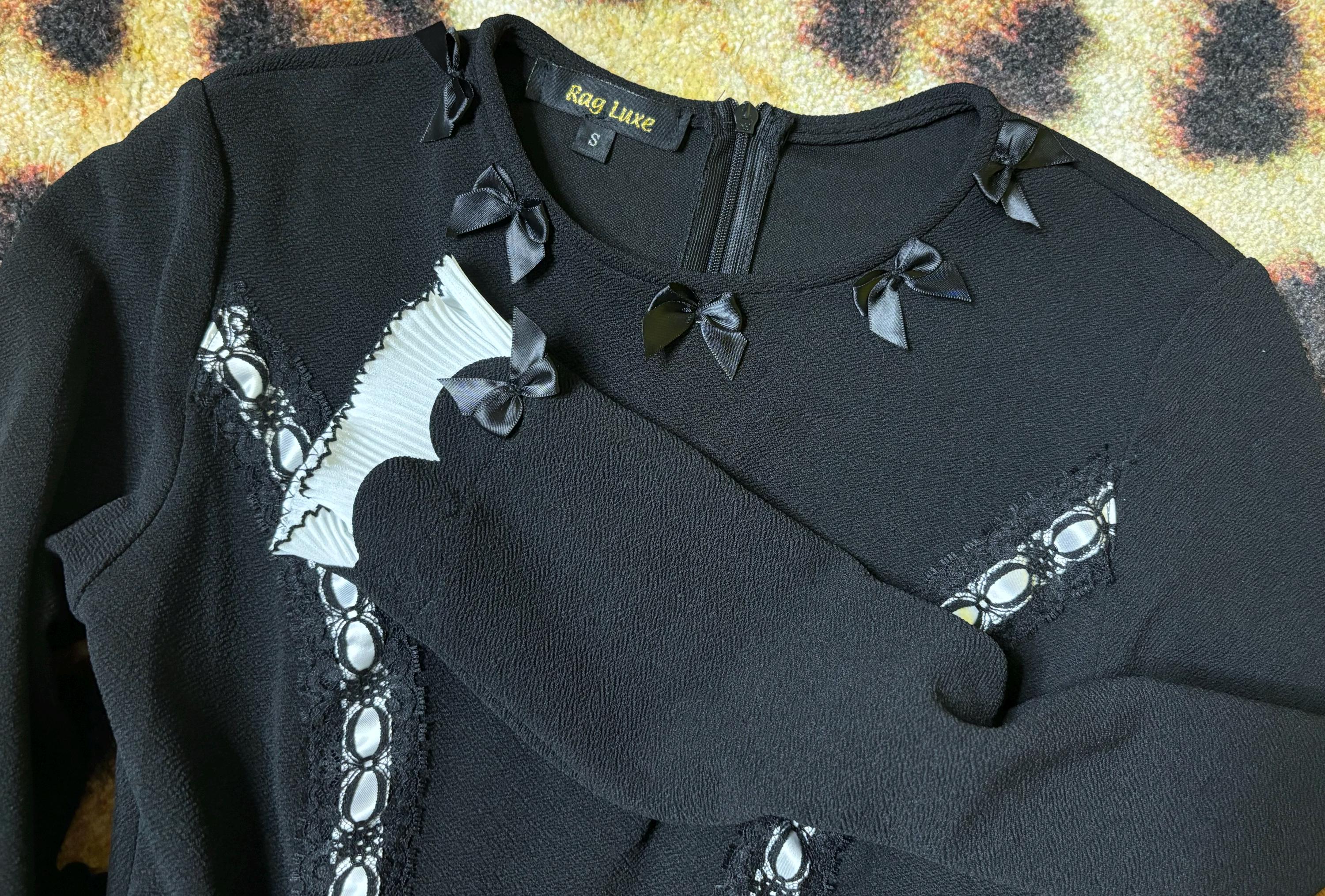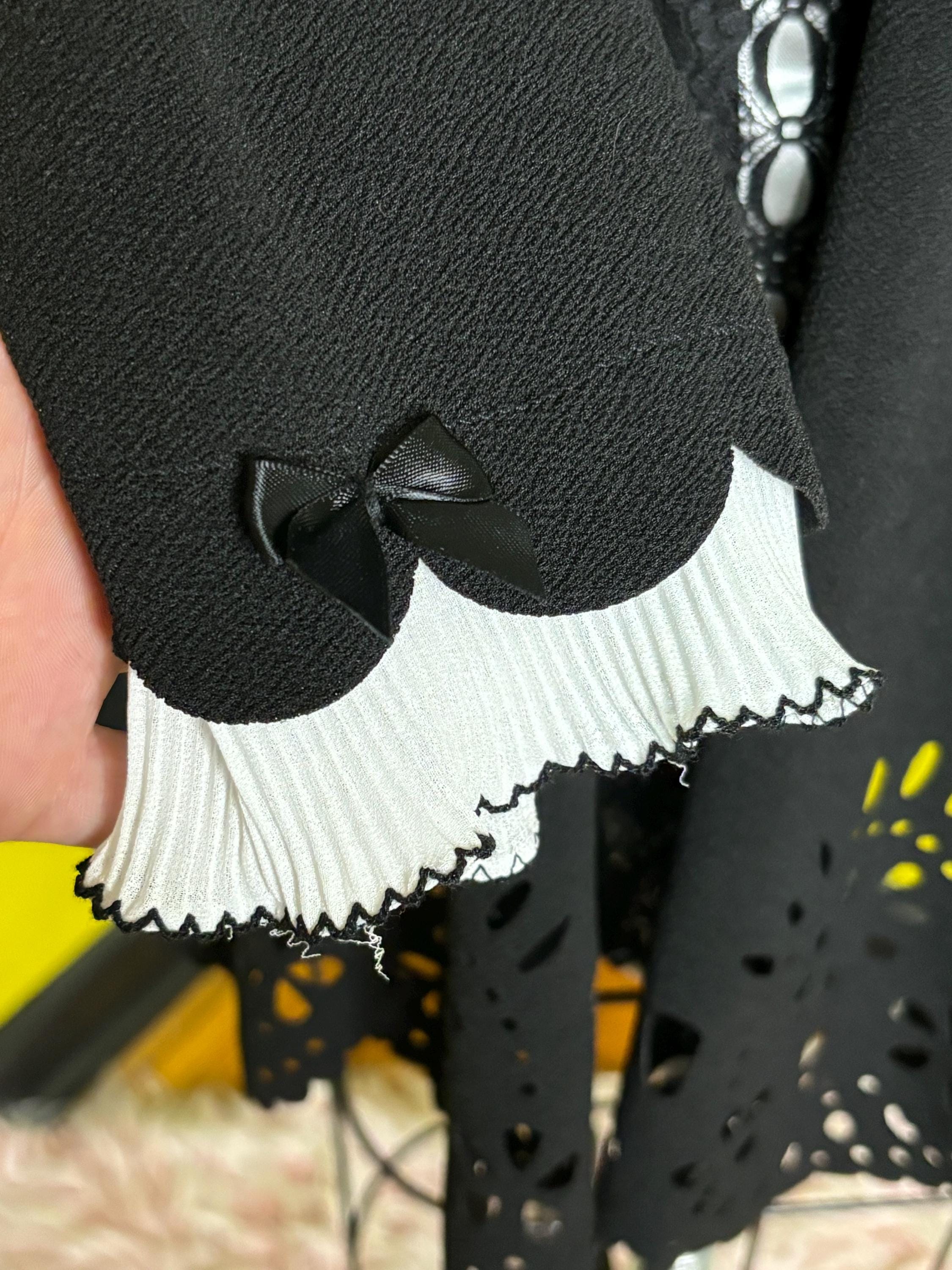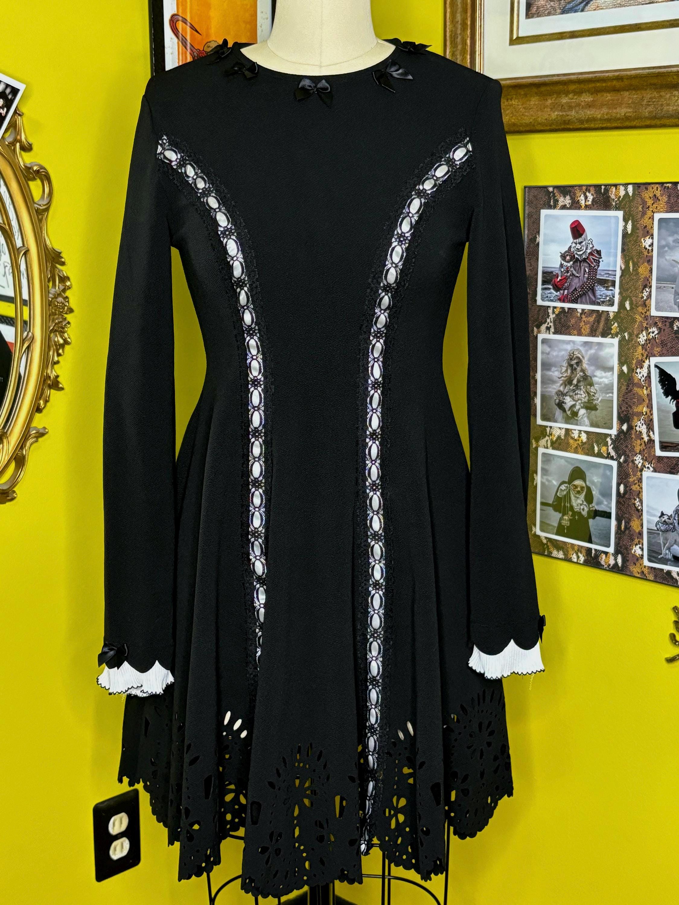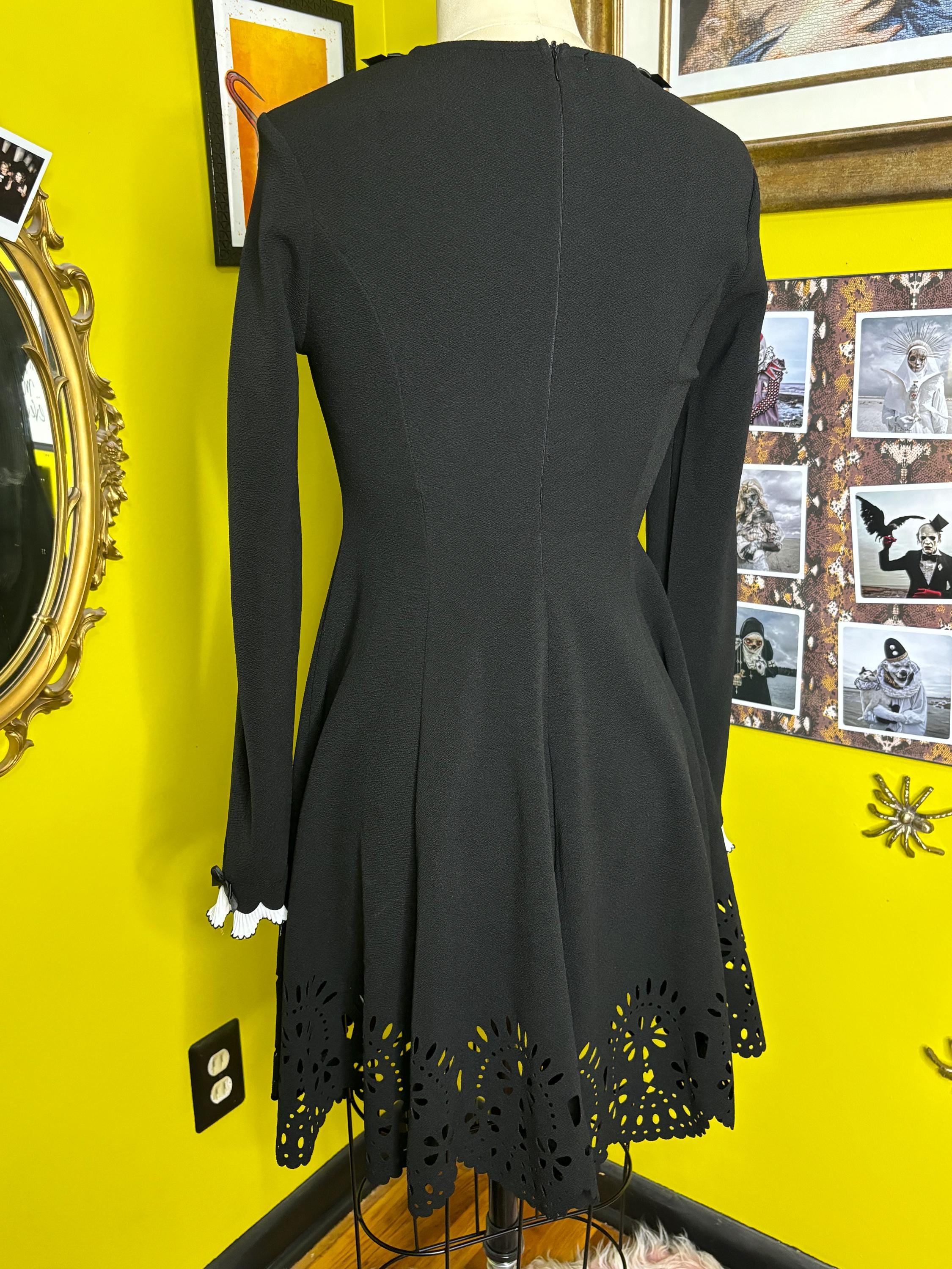 Black stretch poly dress with white eyelet ribbon trim and pleated ruffle cuffs. Dress has a bow lined neck laser cut hem and zip back closure.Size SmallBust 33-34"Waist 26-28"Hip freeUnderarm to hem 27"