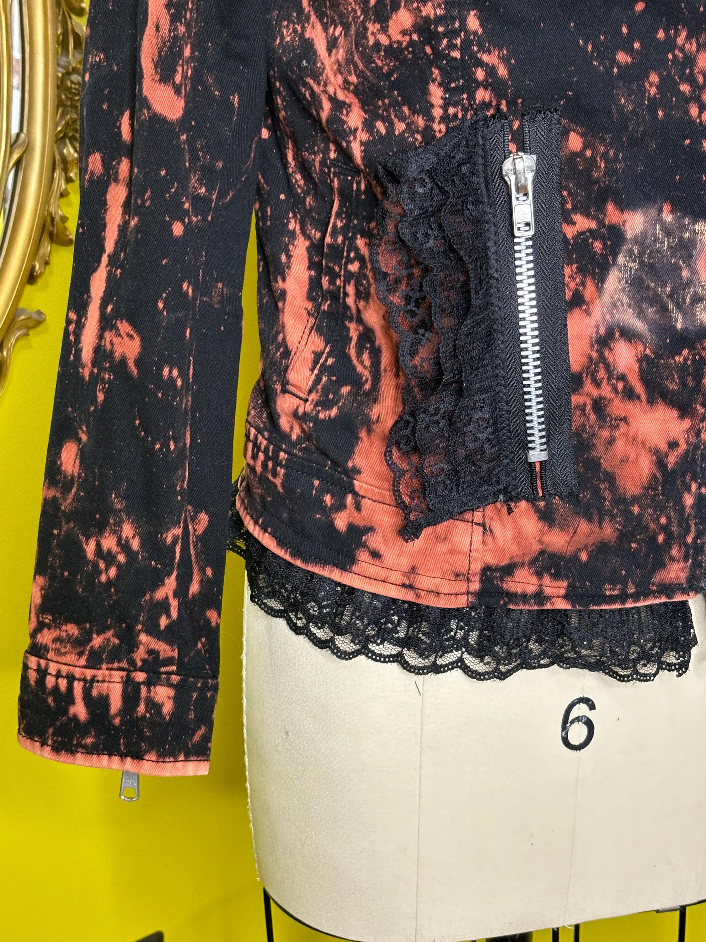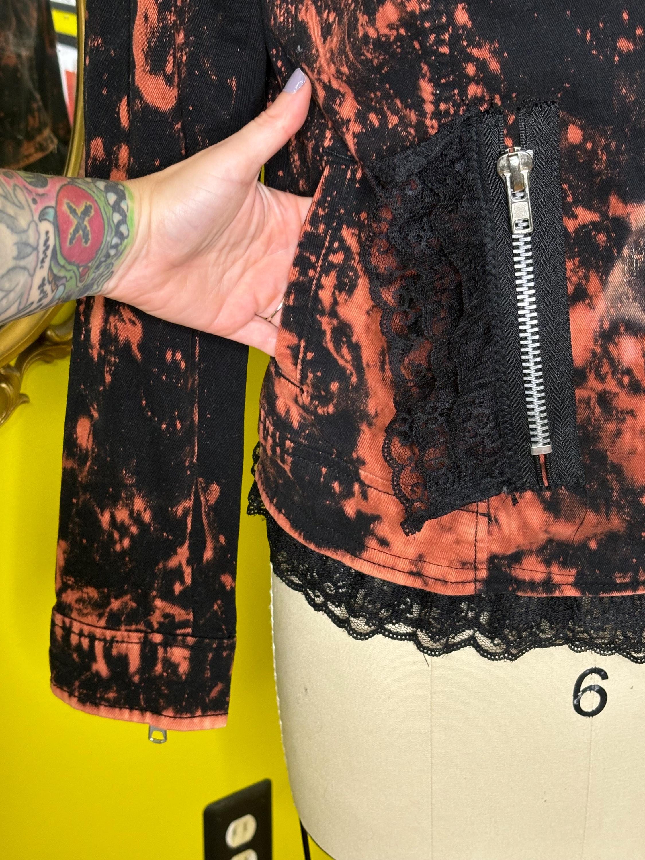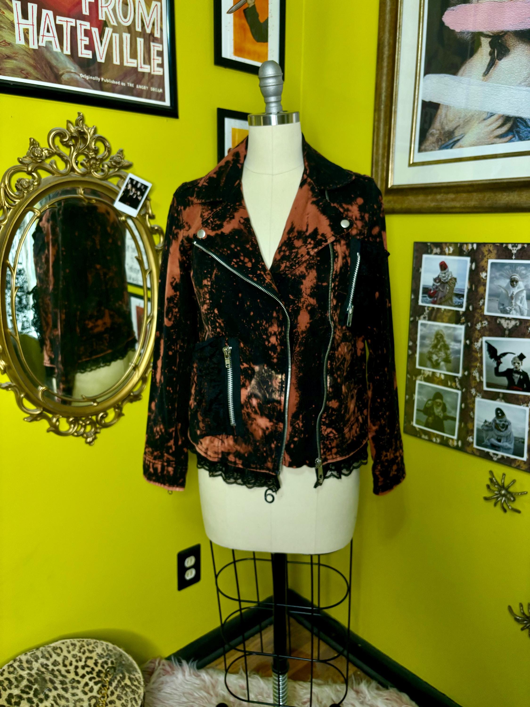 Black acid washed motorcycle jacket with jumbo zippers, lace ruffle trim and side front pockets. Jacket is a soft, medium weight cotton, unlined. Size Small-MediumBust 34-36" Waist 30-34"Underarm to hem 13"