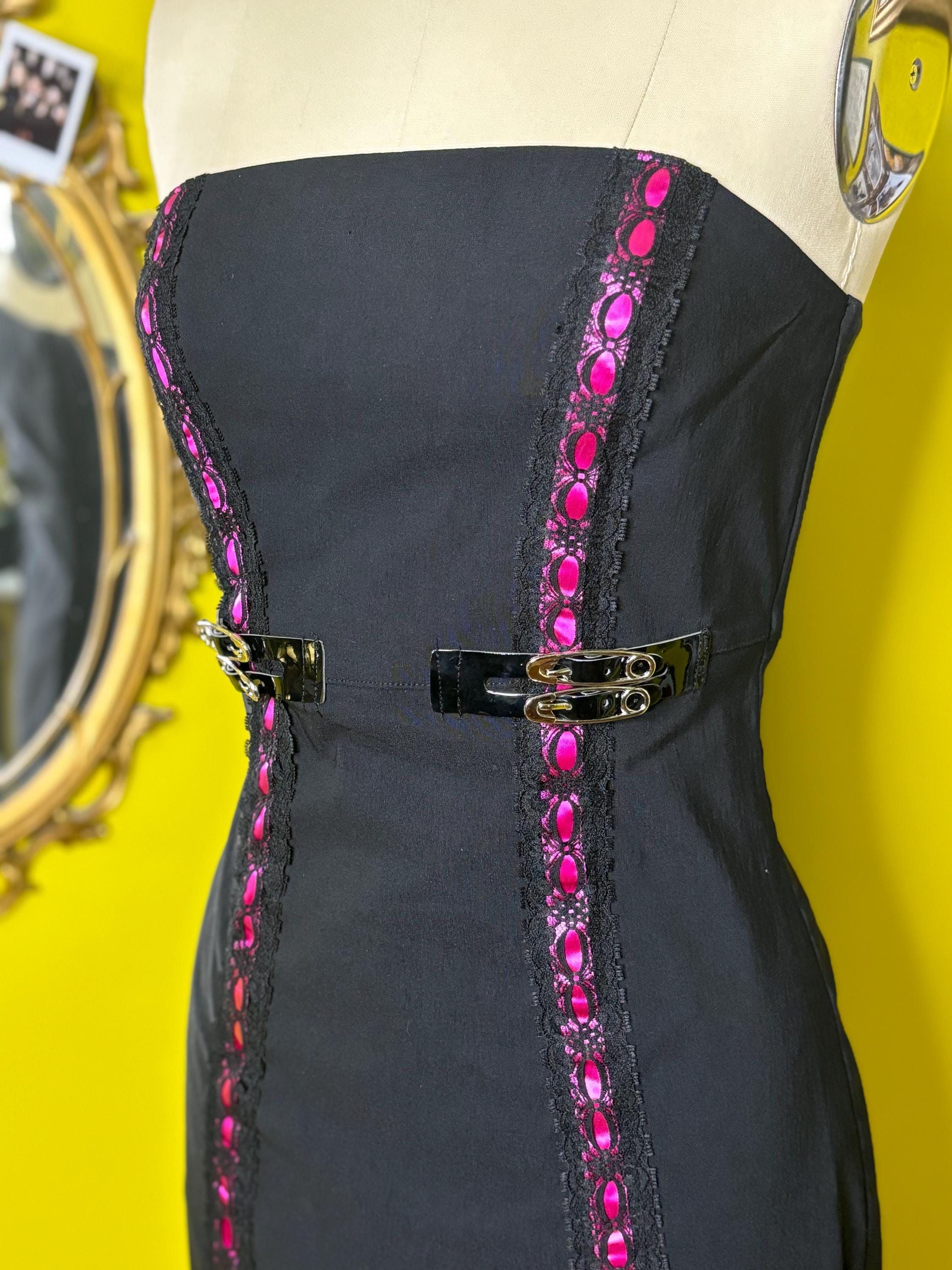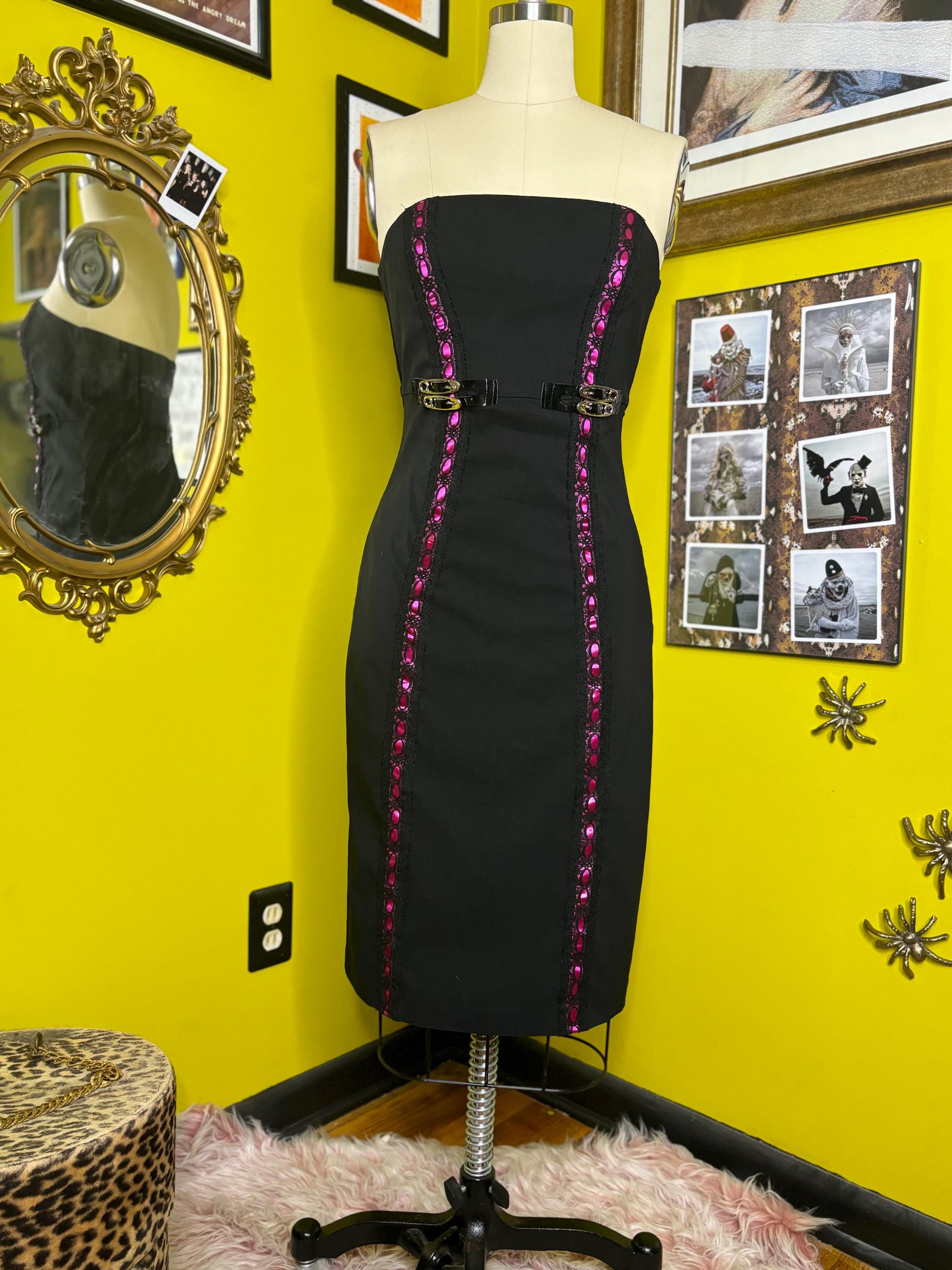 Black stretch poplin dress with added hot pink ribbon trim and princess seam faux buckles. Dress is fully lined with stretch and a zip back closure. Size SmallBust 34-35"Waist 28-29"Hip up to 37"Underarm to hem 33"