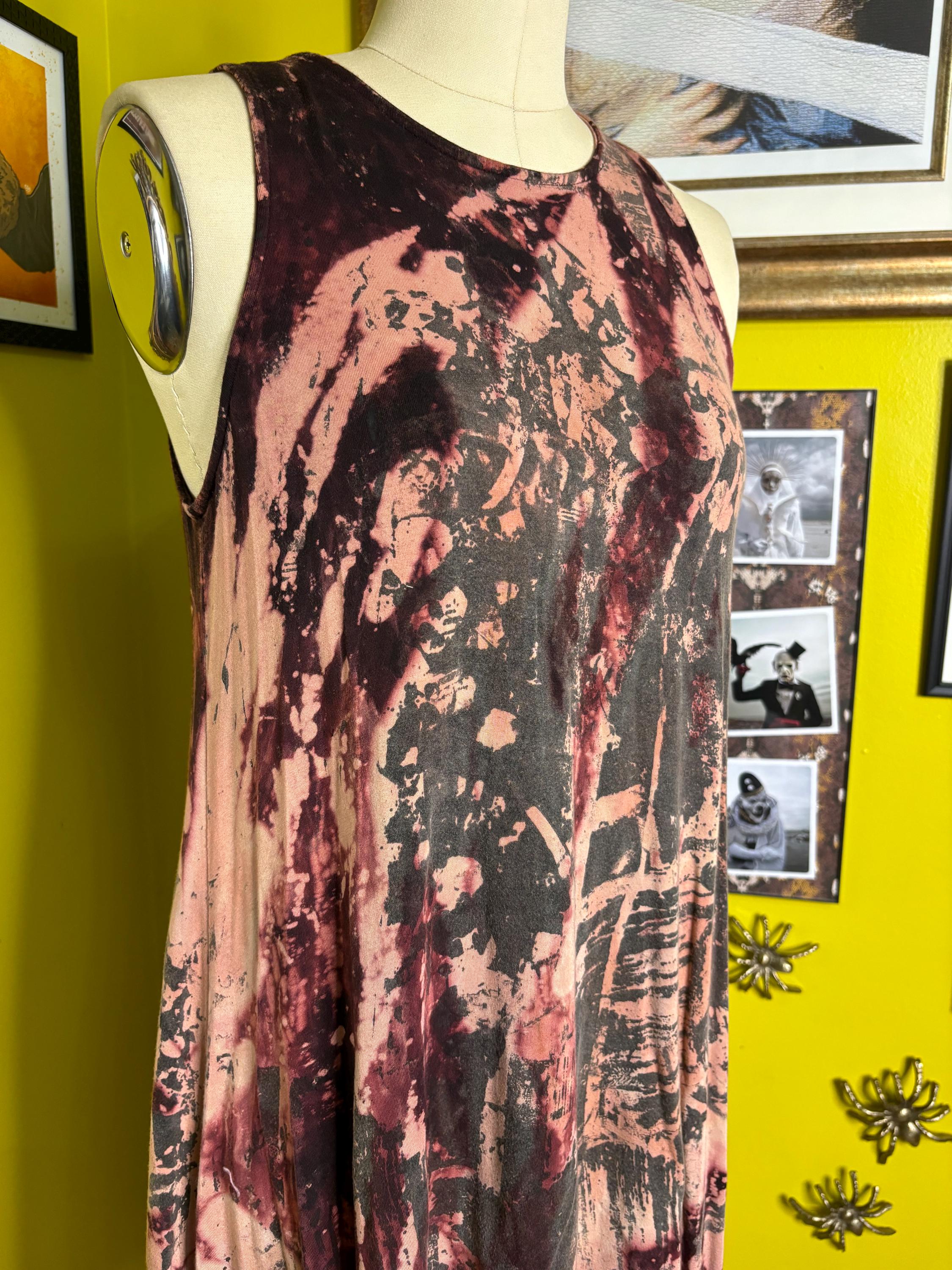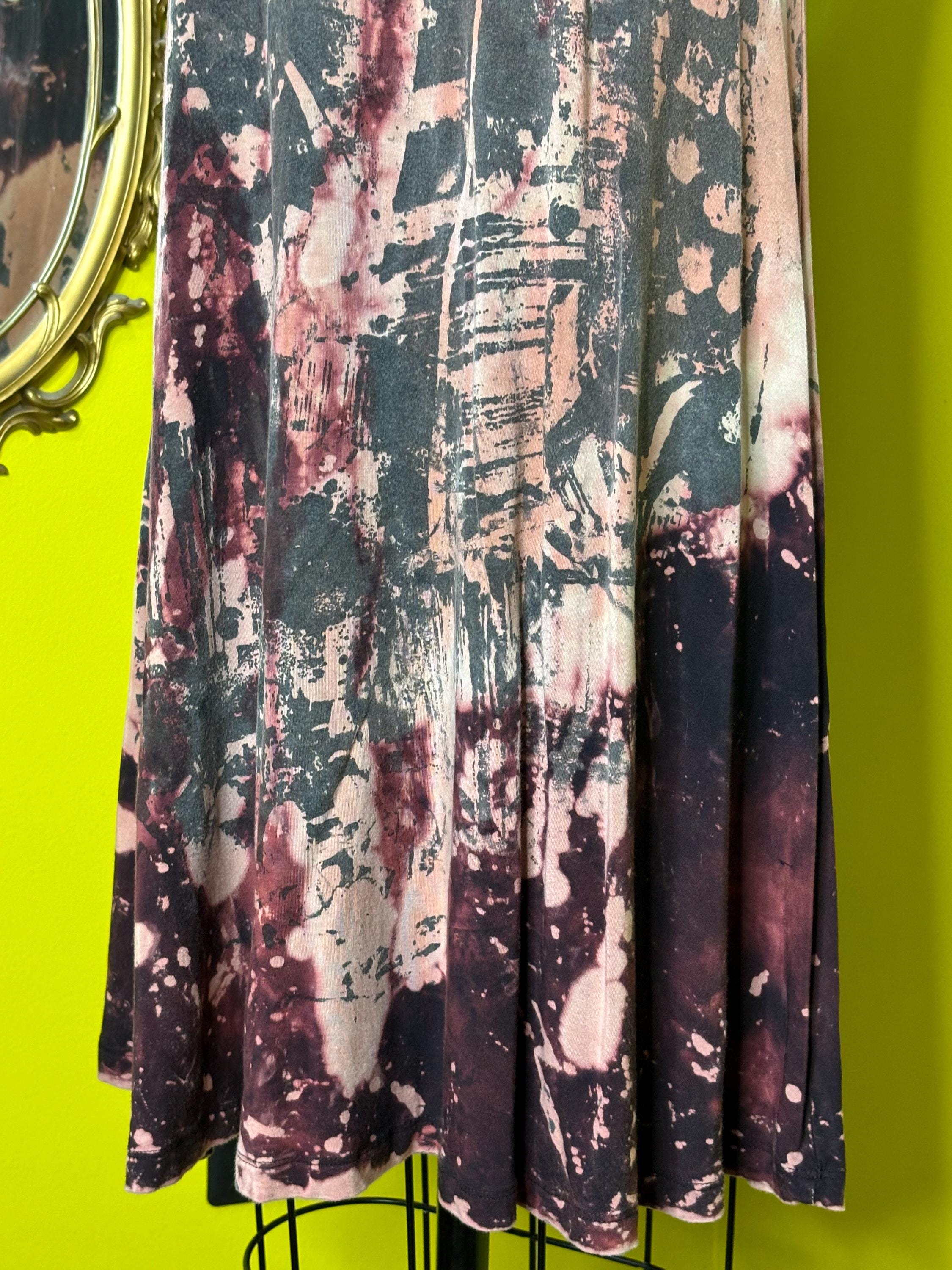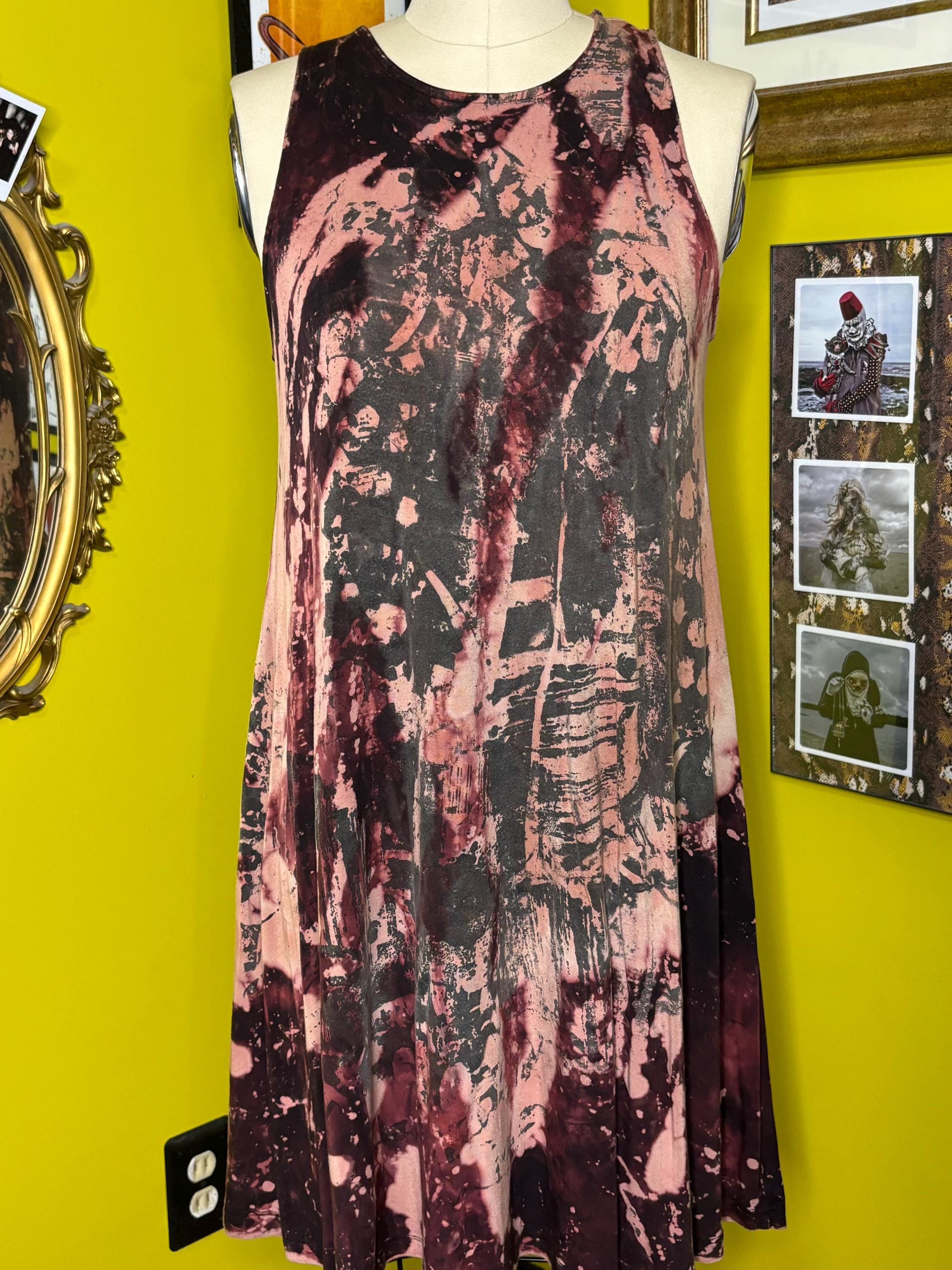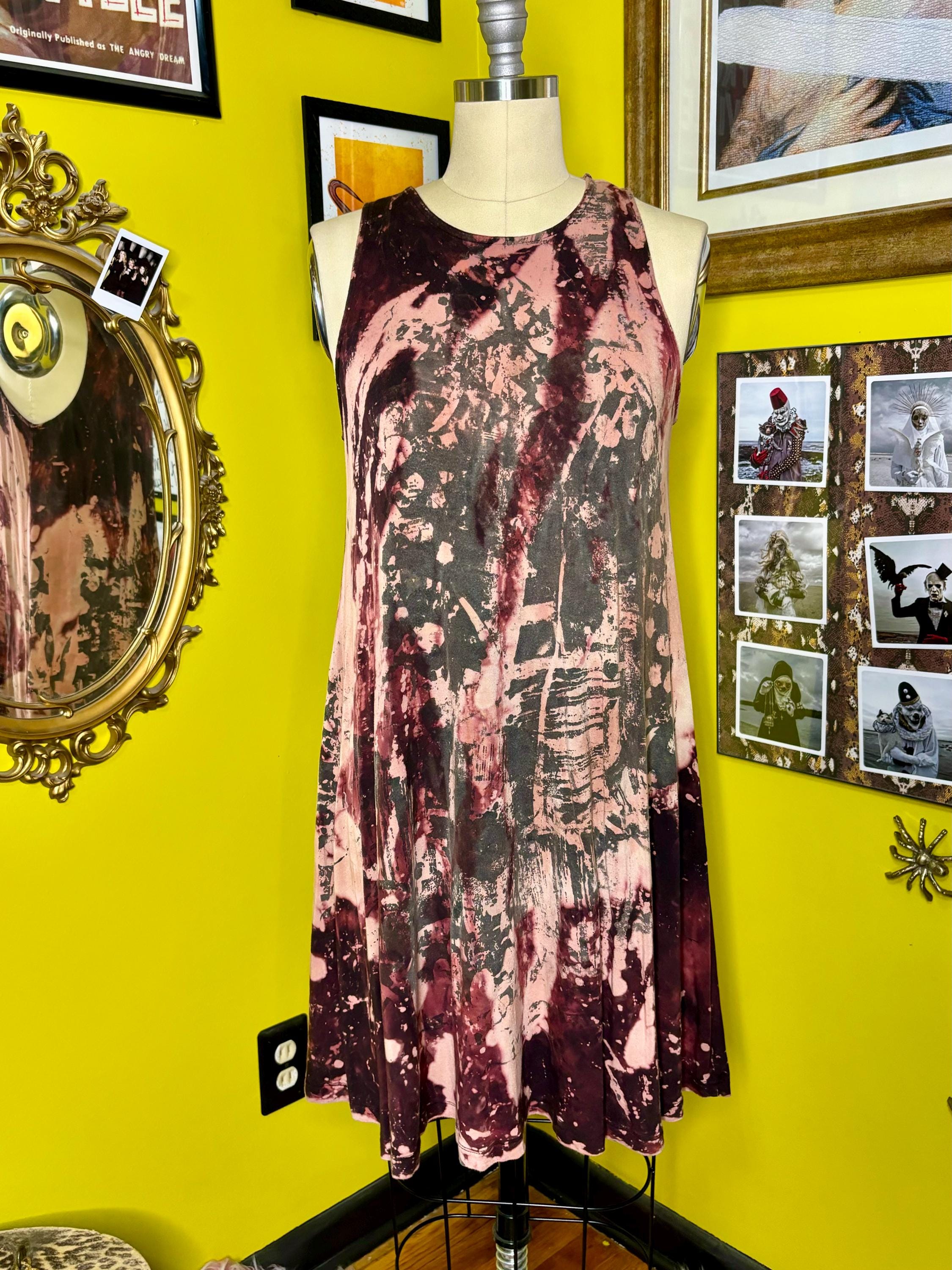 Black soft cotton dress dipped in an acid bath and printed with a unique collage pattern. Dress has a scoop neckline and full skirt.Size Medium-LargeBust 36-40"Waist 34-38"Hip up to 48"Underarm to hem 27'