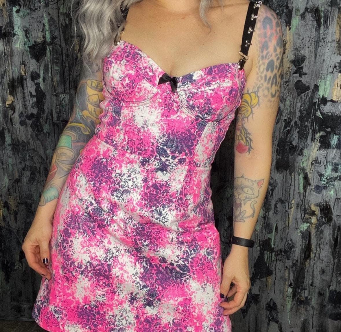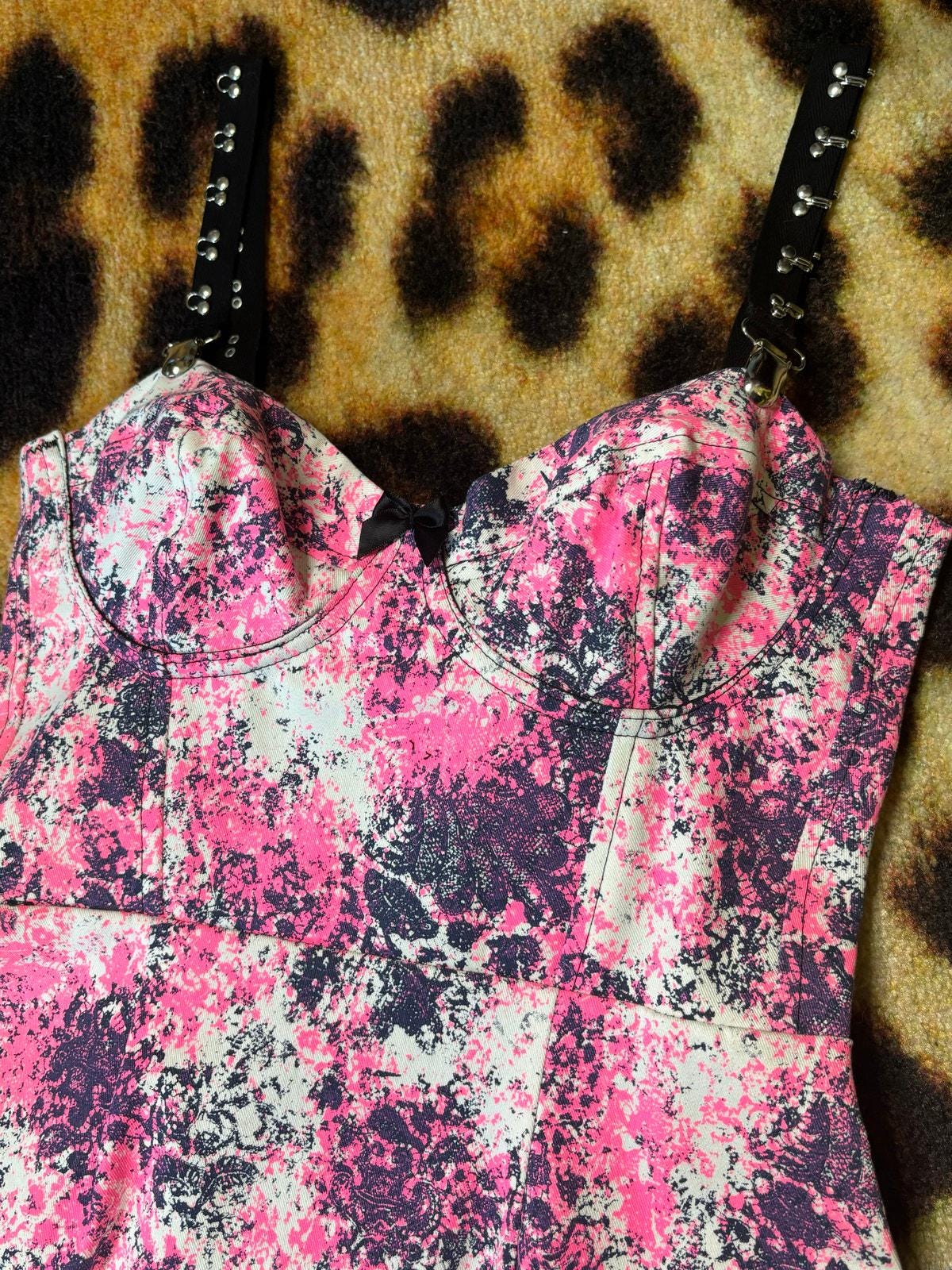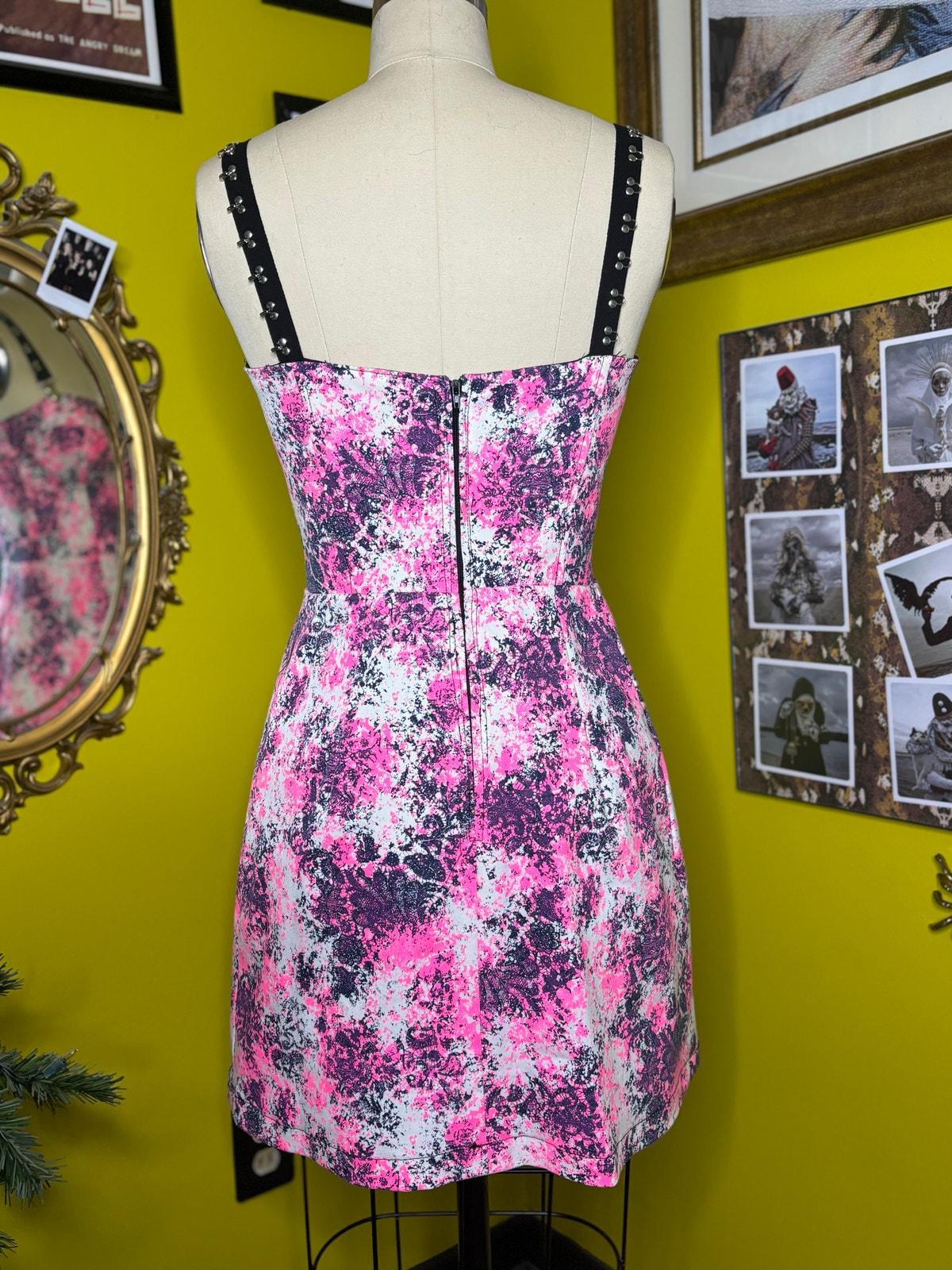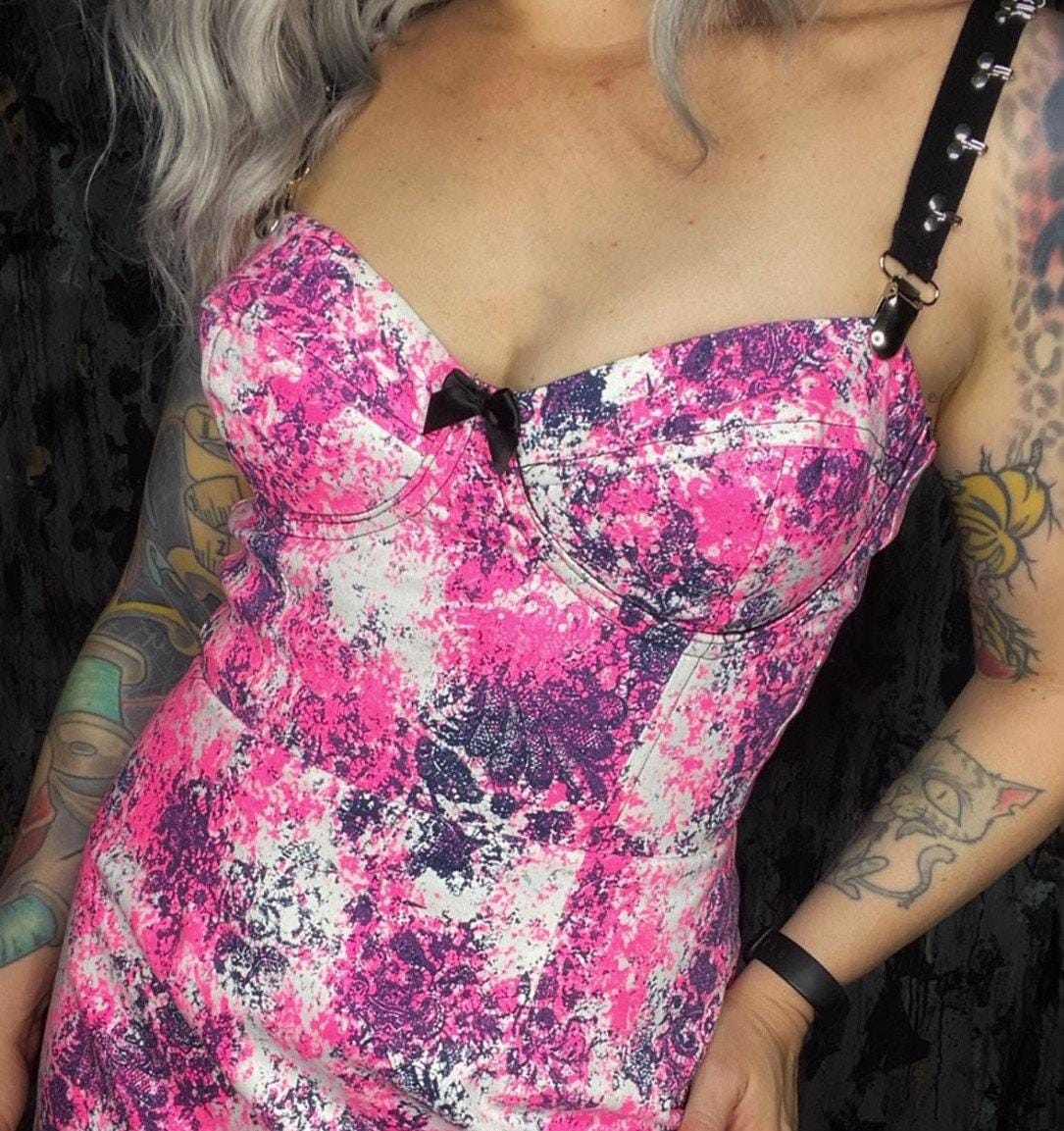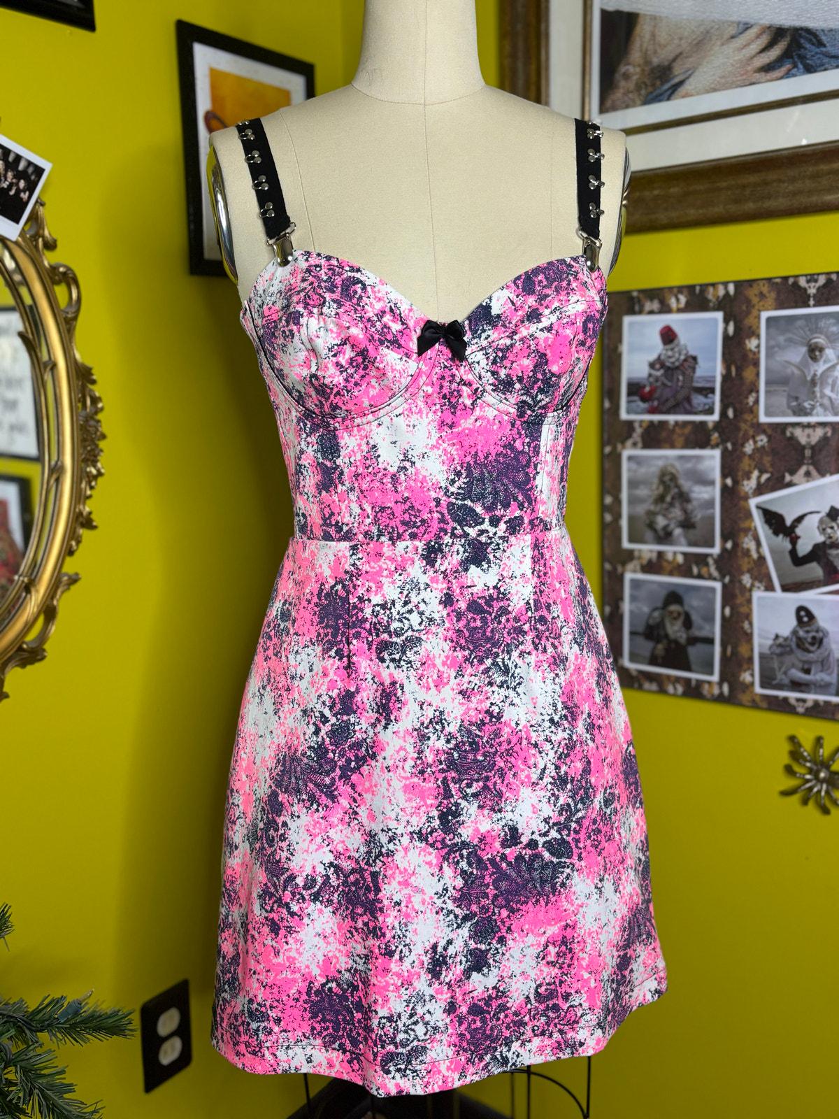 Made from scratch buster dress with semi-stretch abstract fabric, unique straps and center front bow. Dress is fully lined with a zip back closure.One of a kind!Size MediumBust 34"Waist 27"'Hip 36-38"Underarm to hem 24"