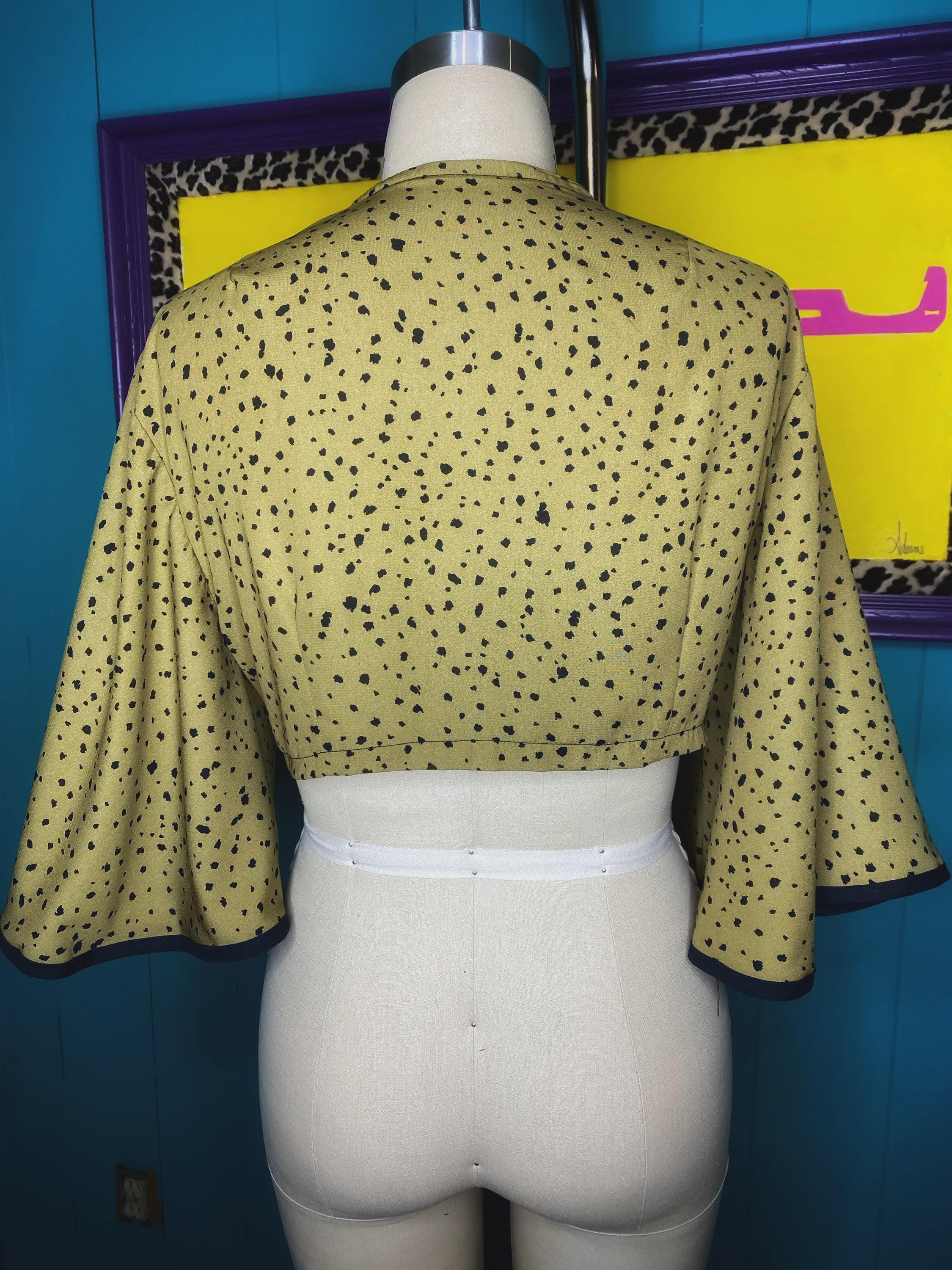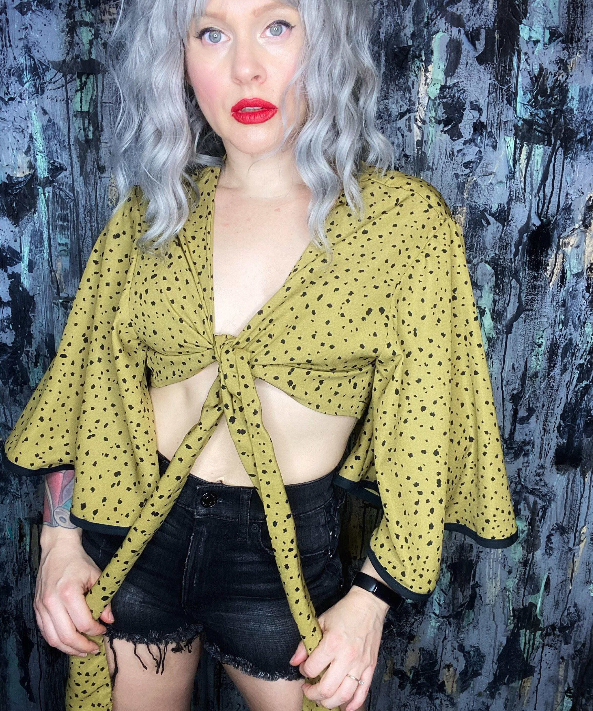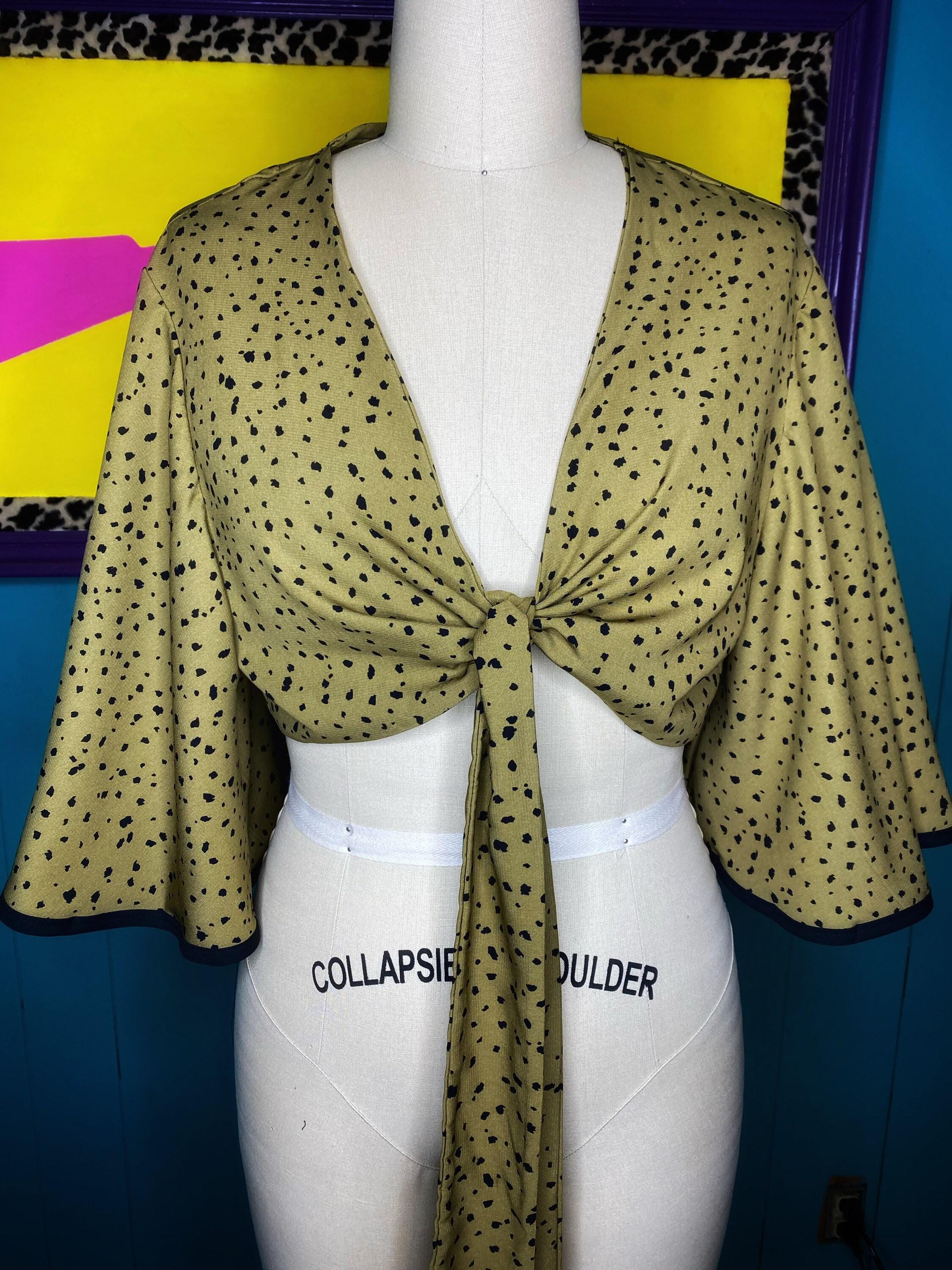 RagLuxe Olive and black cheetah print tie top with several tie options. Top has giant flouncy sleeves and black contrast trim. Handmade and one of a kind.