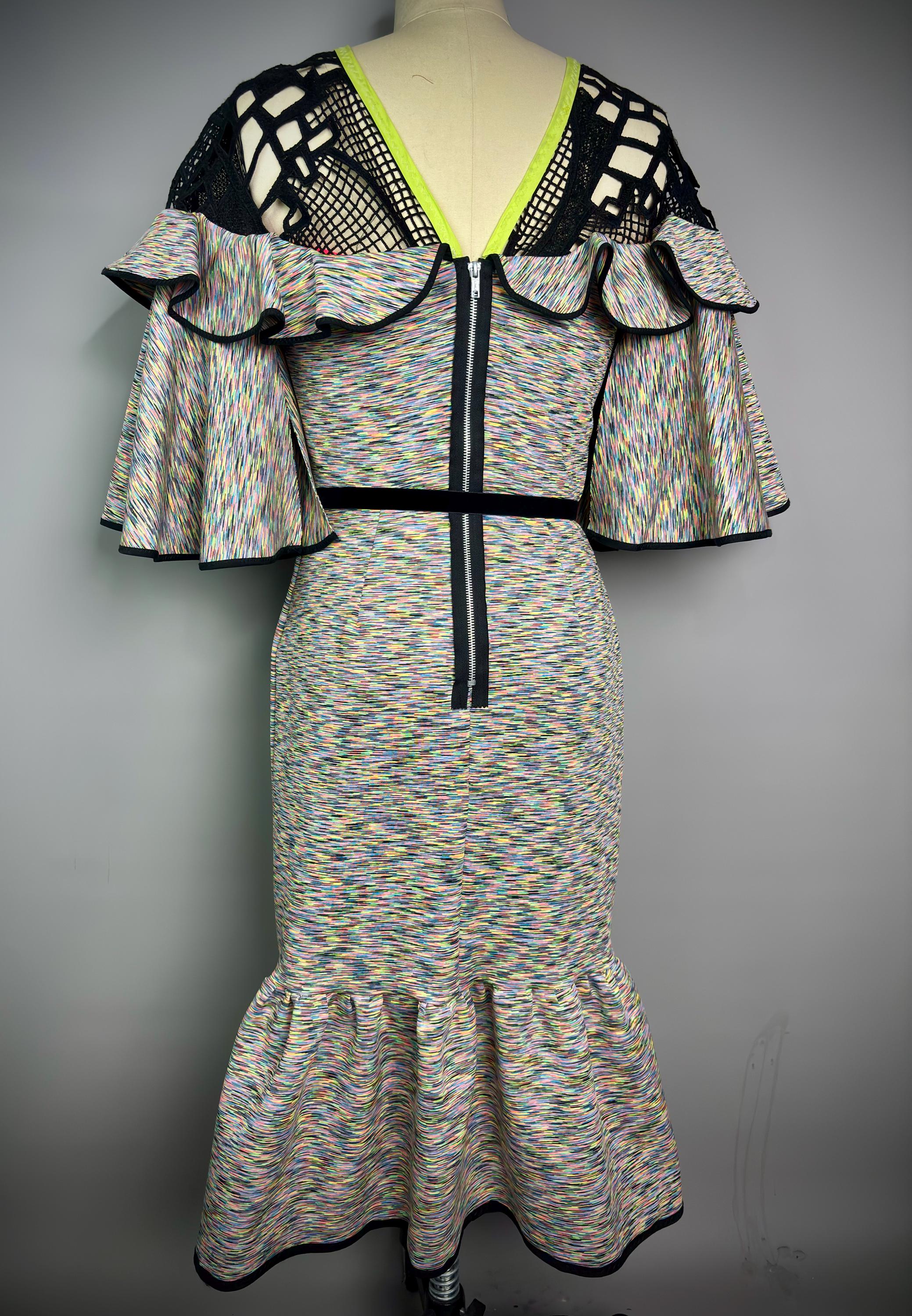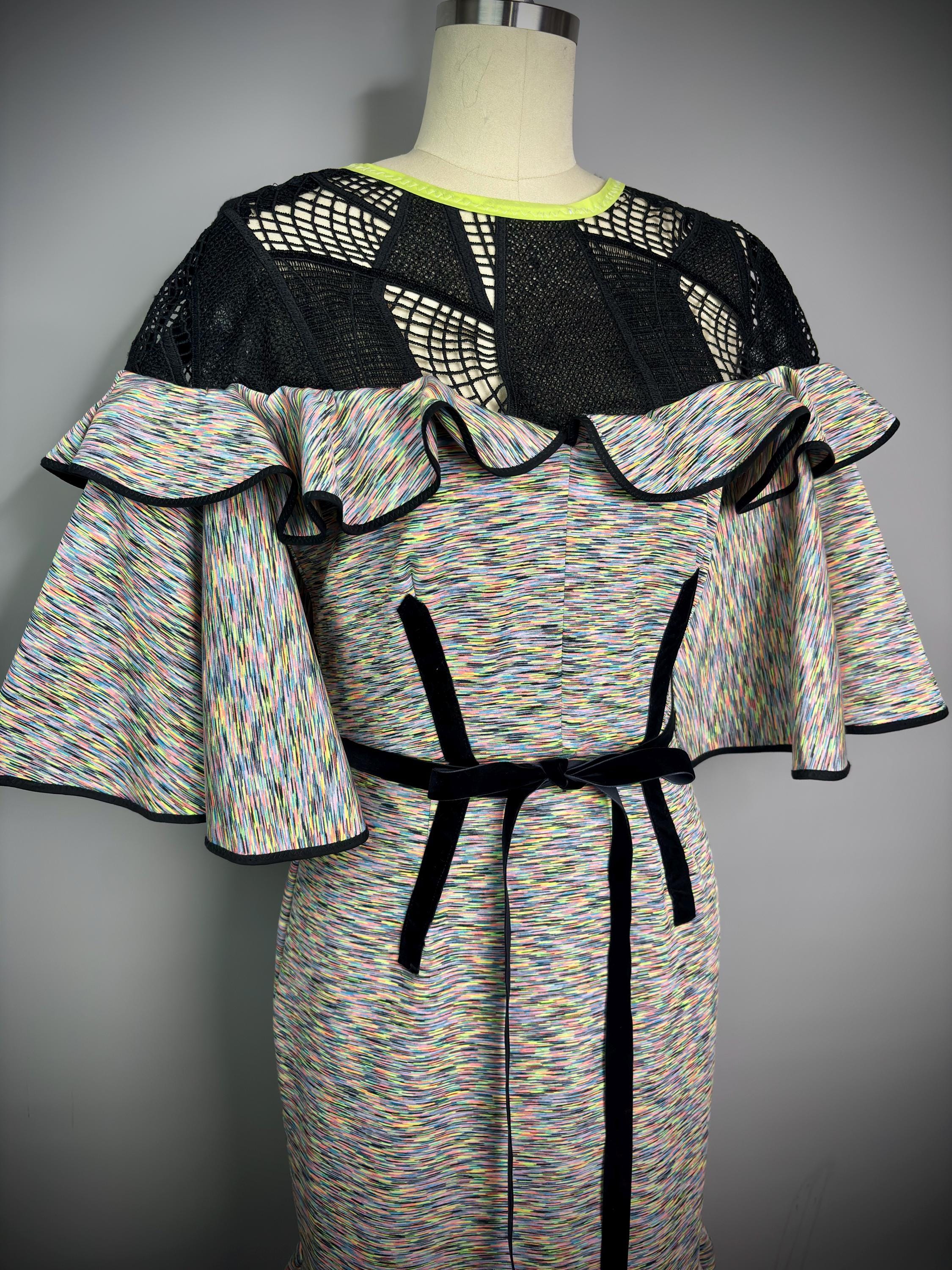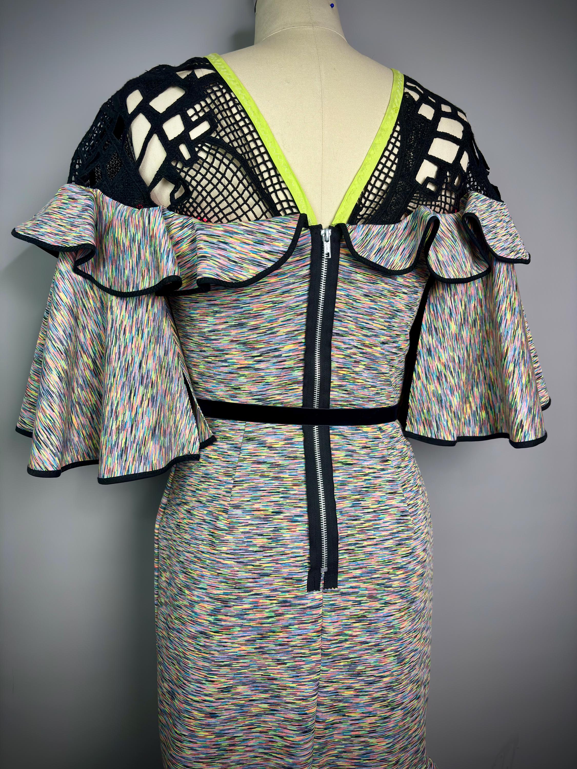 The perfect RagLuxe one-of-a-kind statement piece dress! Handcrafted with meticulous care, this dress features vibrant striped neoprene fabric that will make heads turn. The ruffled sleeves add a playful touch, while the black velveteen contrast detailing adds a touch of elegance. Side seams have lightweight boning and the bodice is lined in neon pink.