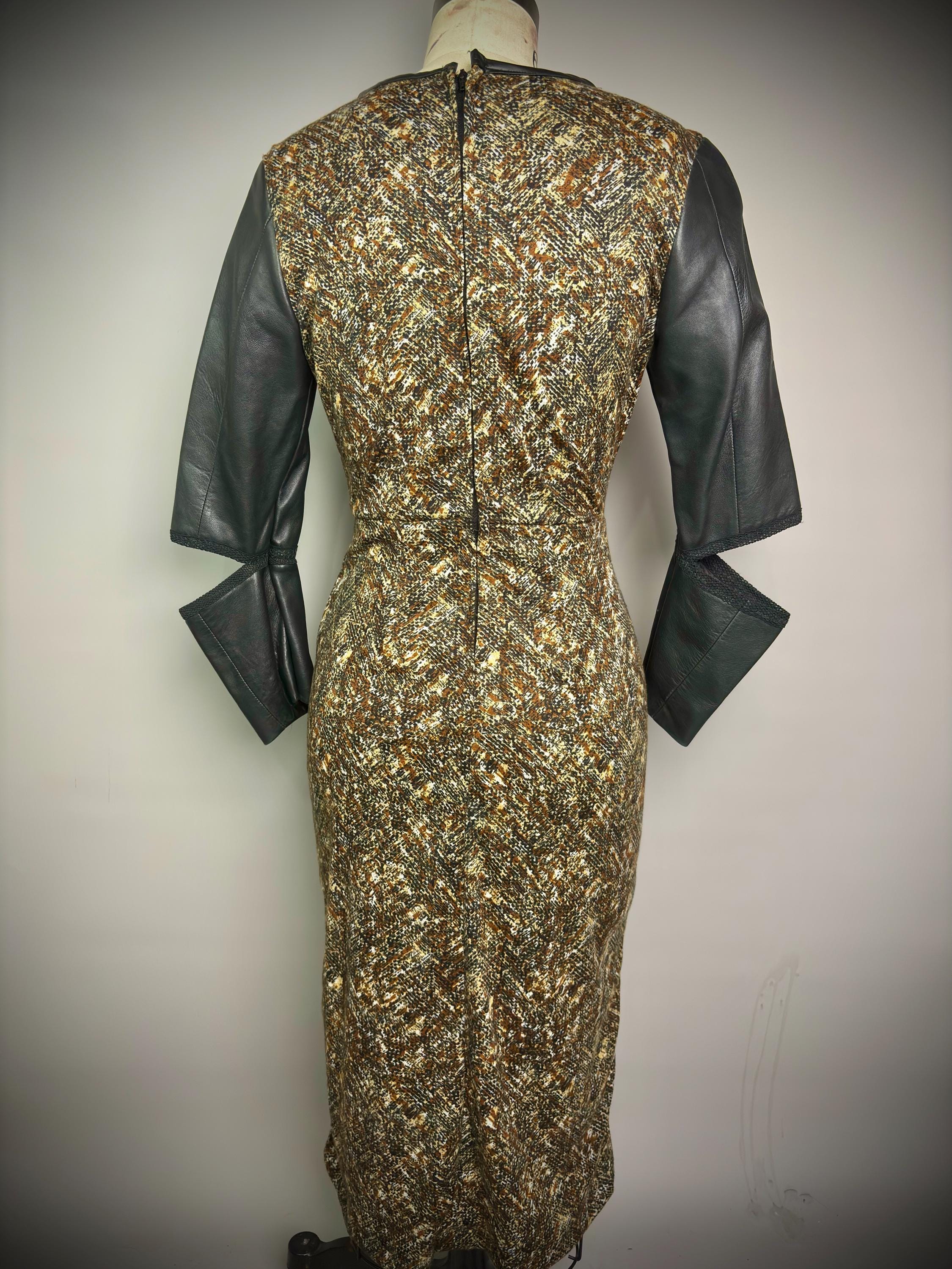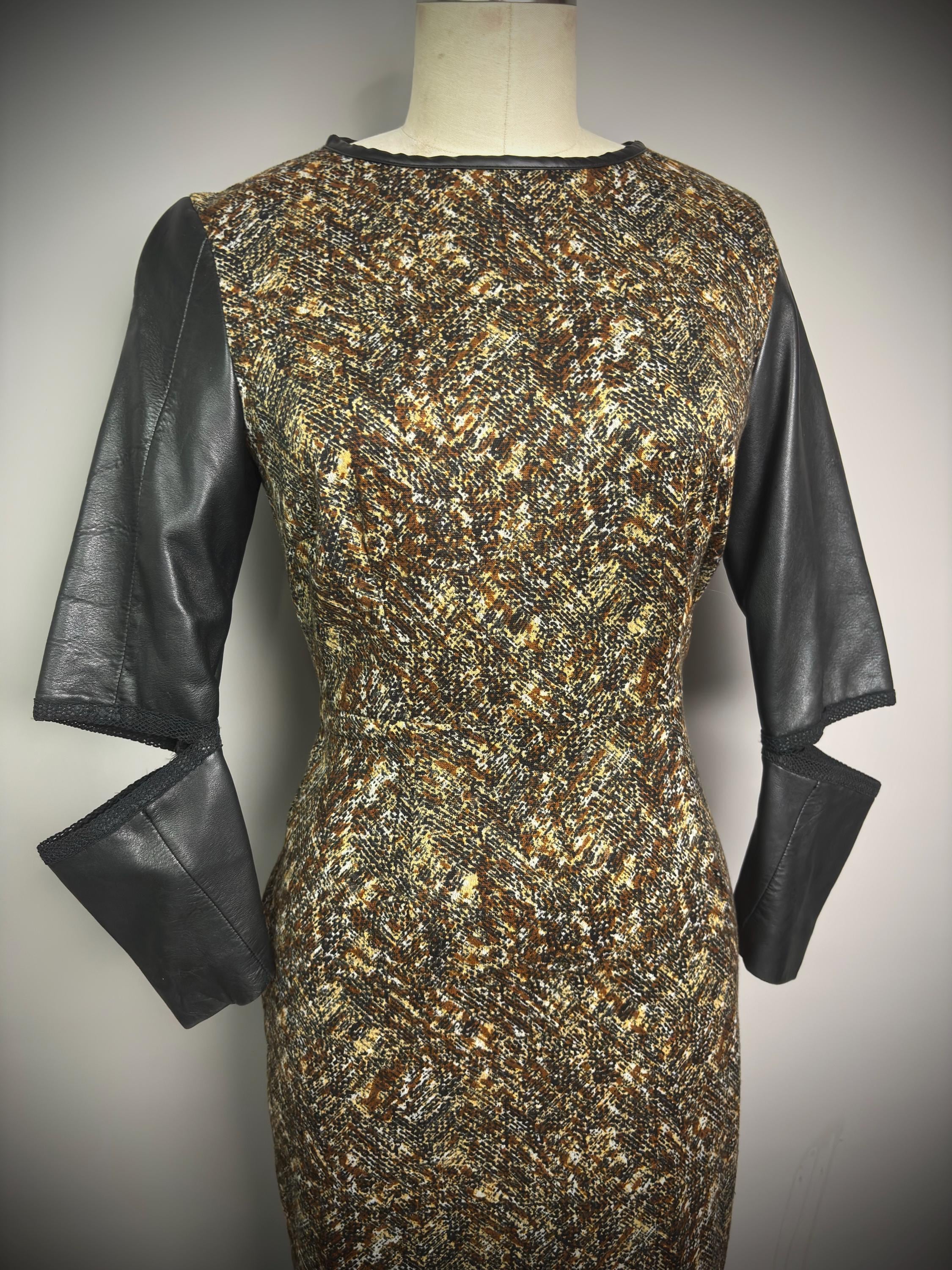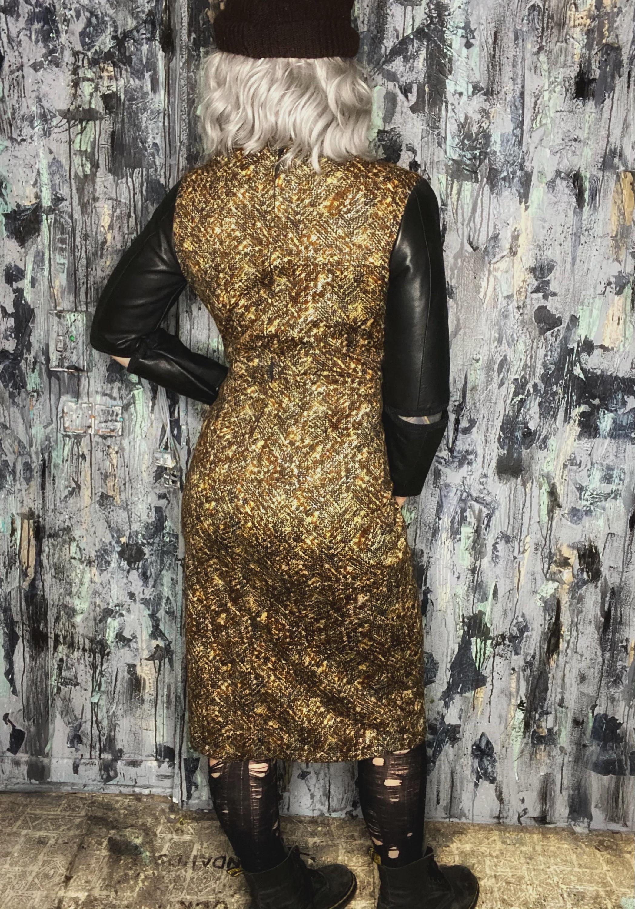 RagLuxe black leather cutout sleeve dress, crafted from repurposed vintage leather. The dress features a distinctive design with cutout sleeves, adding a touch of edginess to your style. The body of the dress is made from a brown stretchy textured herringbone print, providing both comfort and a fashionable twist. This dress is truly one of a kind, making it a perfect choice for those seeking alternative fashion pieces.