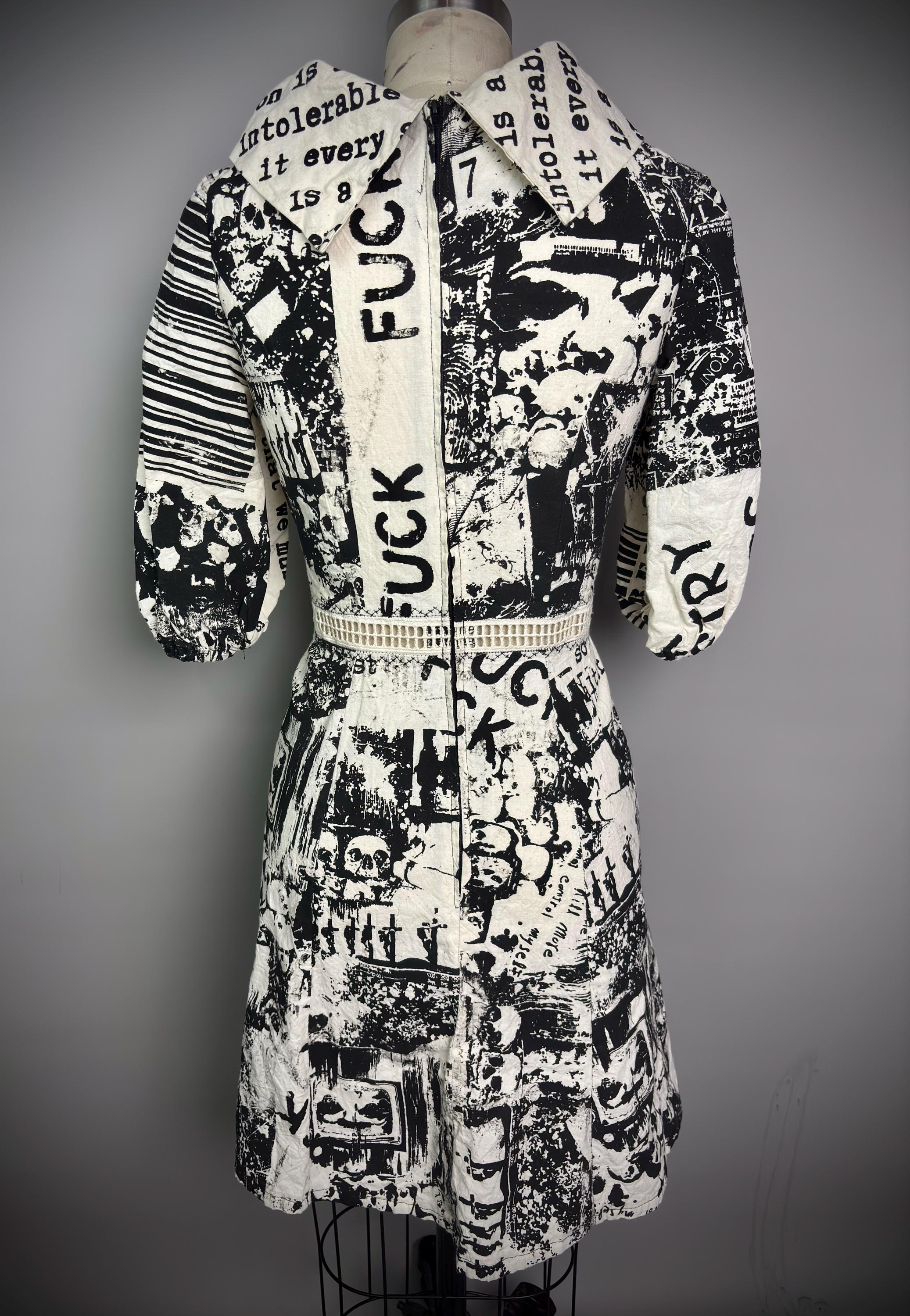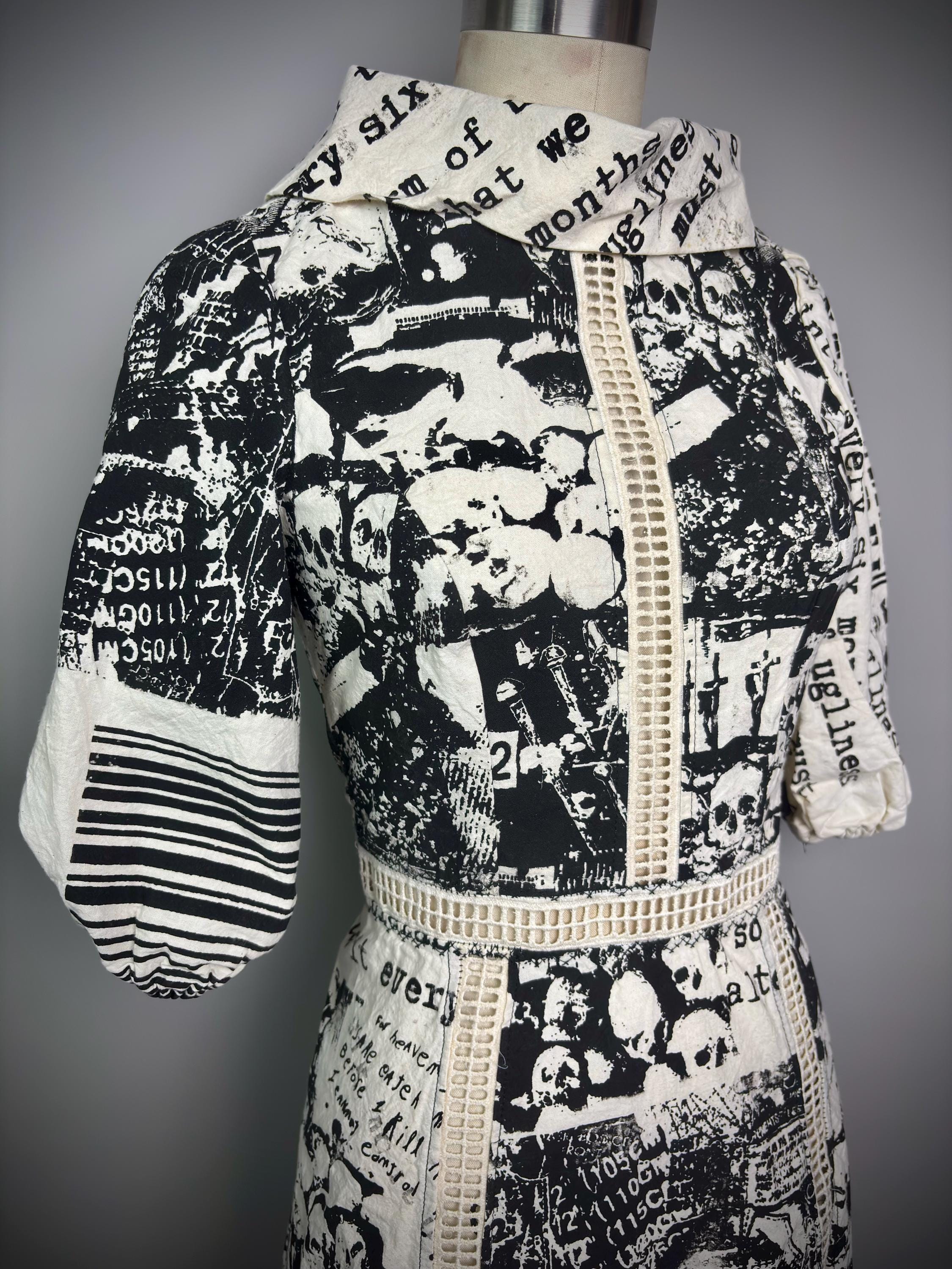 RagLuxe natural colored cotton dress with serial killer abstract print, mesh trim, fold down collar and gathered sleeves. Dress has A-line skirt and zip back closure. One of a kind,