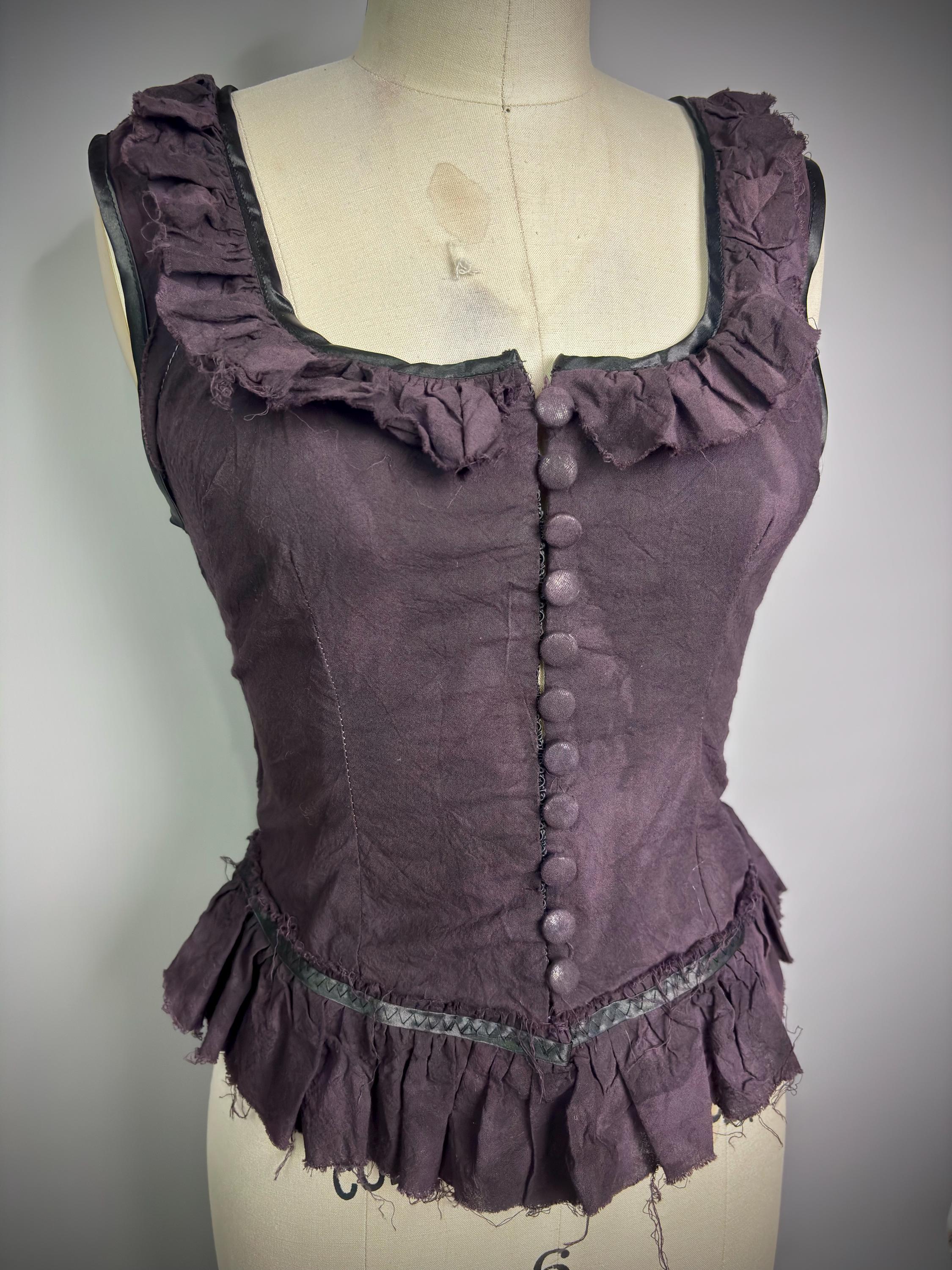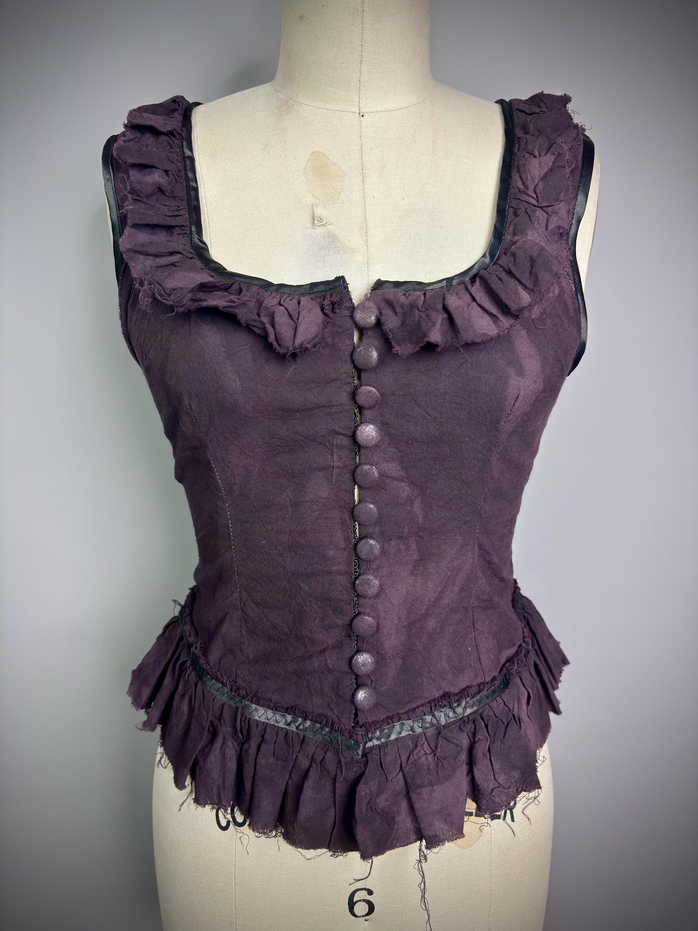 RagLuxe hand dyed cotton milkmaid top with covered buttons, raw edged ruffles and faded satin trim.One of a kind.Size SmallBust 32-34"Waist 26-27"Underarm to hem at side seam 10”