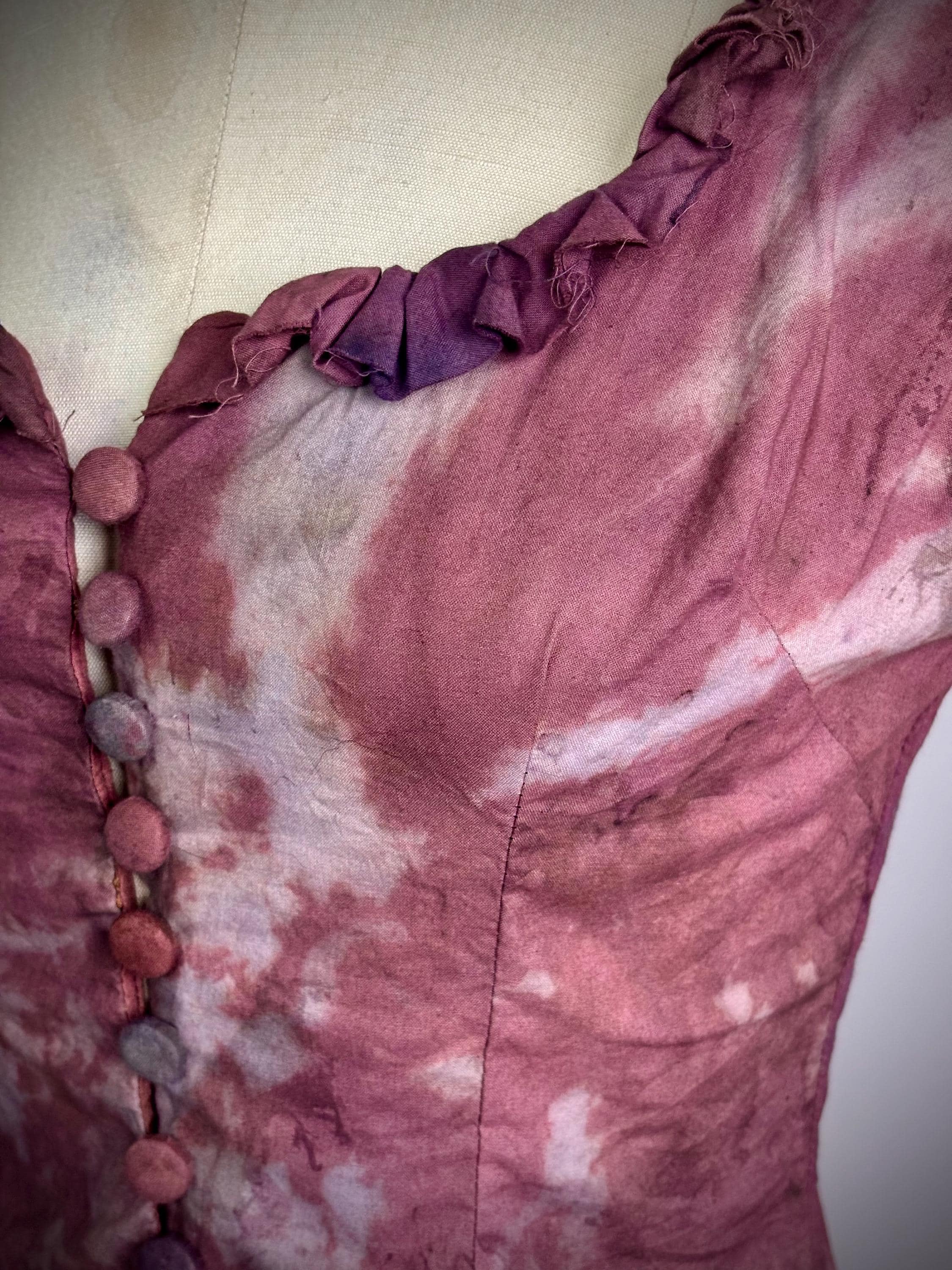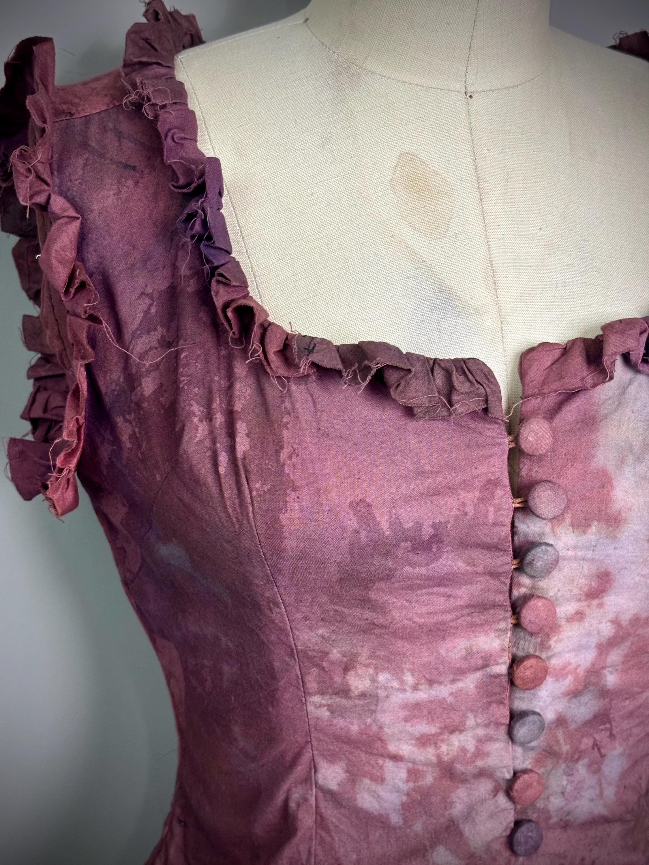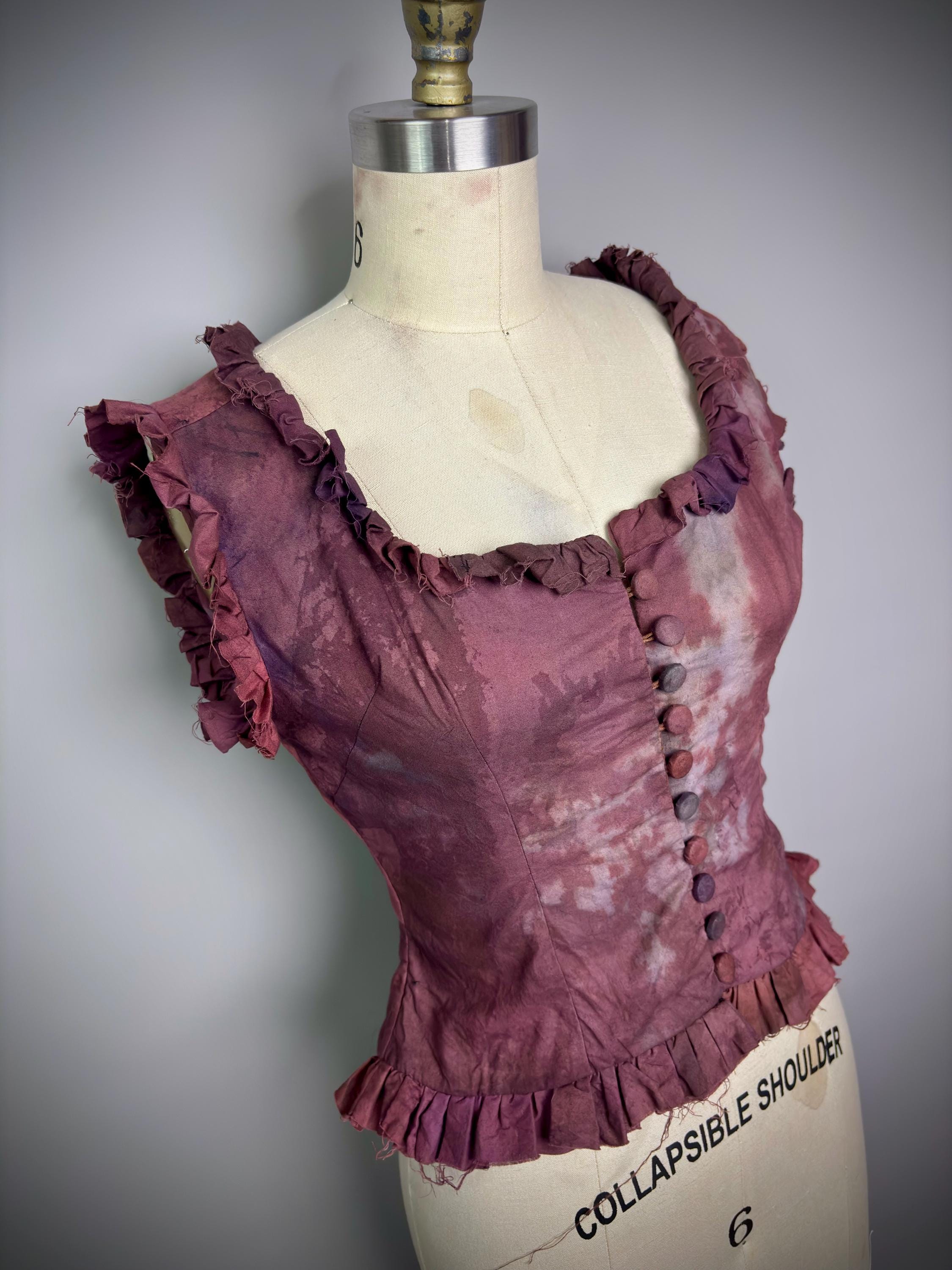 RagLuxe faded red bleached milkmaid top with raw edged ruffles and covered loop button closure.One of a kind.Size SmallBust 32-34"Waist 26-27"Underarm to hem at side seam 10”