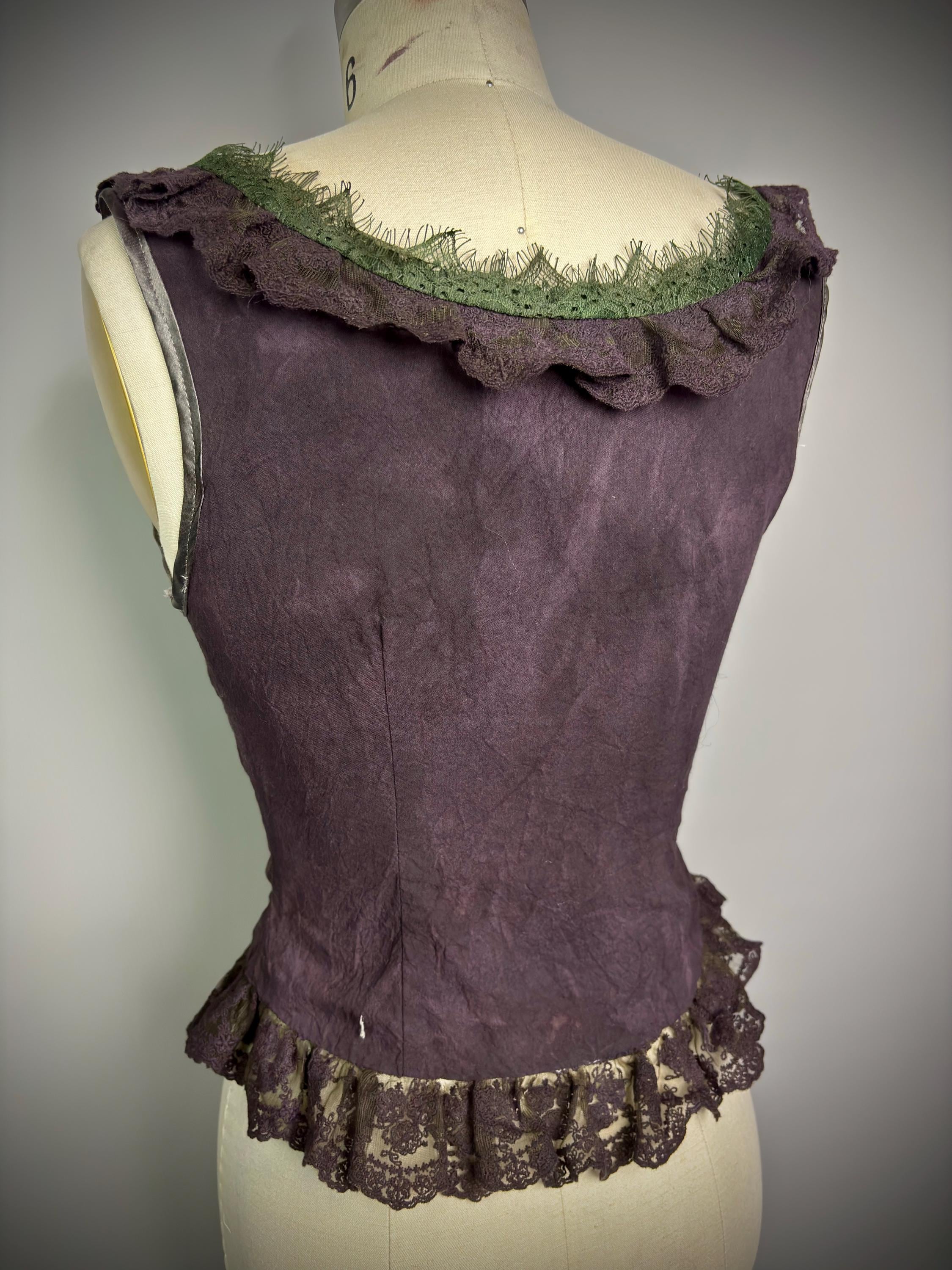 RagLuxe hand dyed purple milkmaid top with dingy green eyelash lace trim and jumbo hook & eye closure.One of a kind.Size SmallBust 32-34"Waist 26-27"Underarm to hem at side seam 11’'