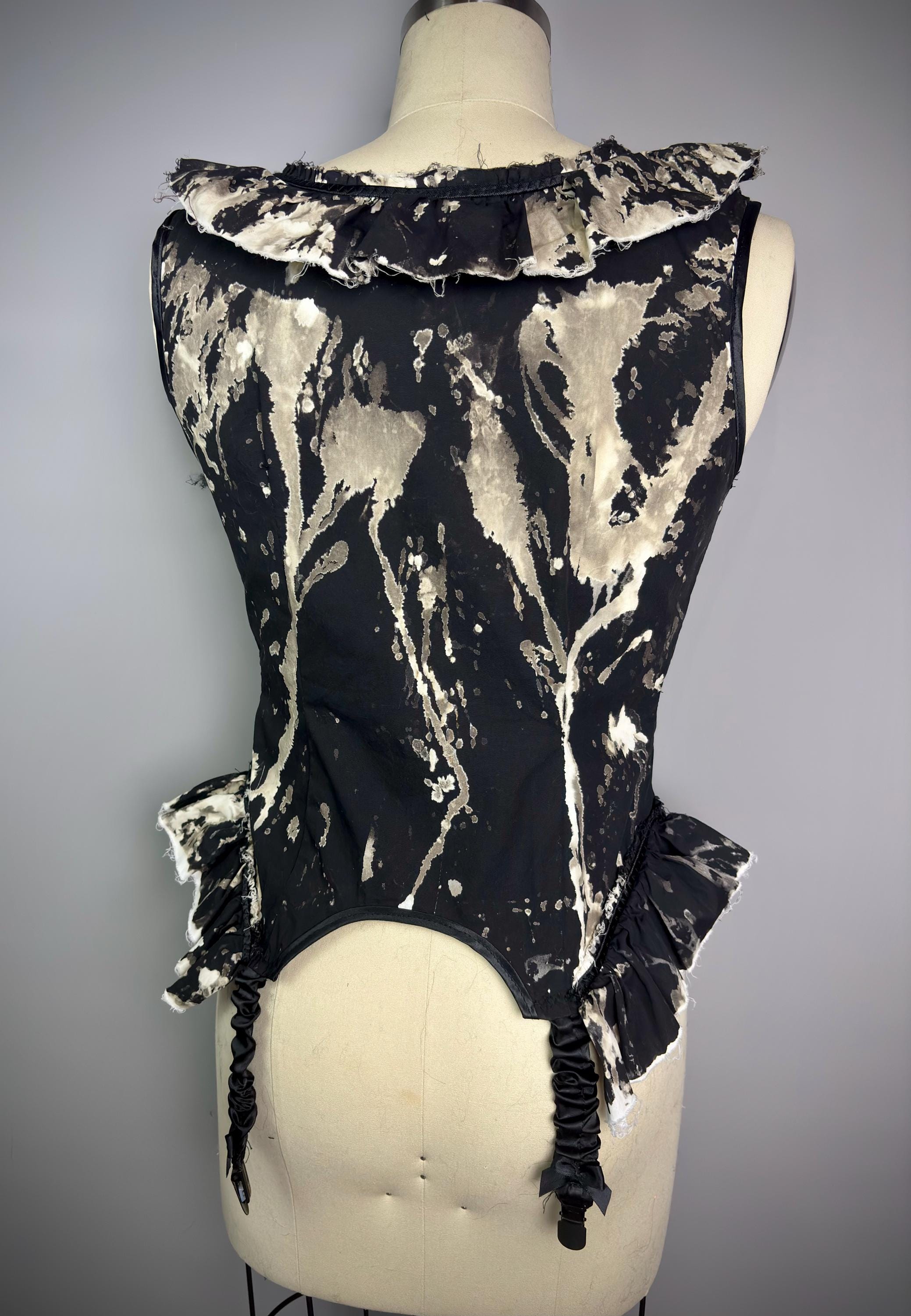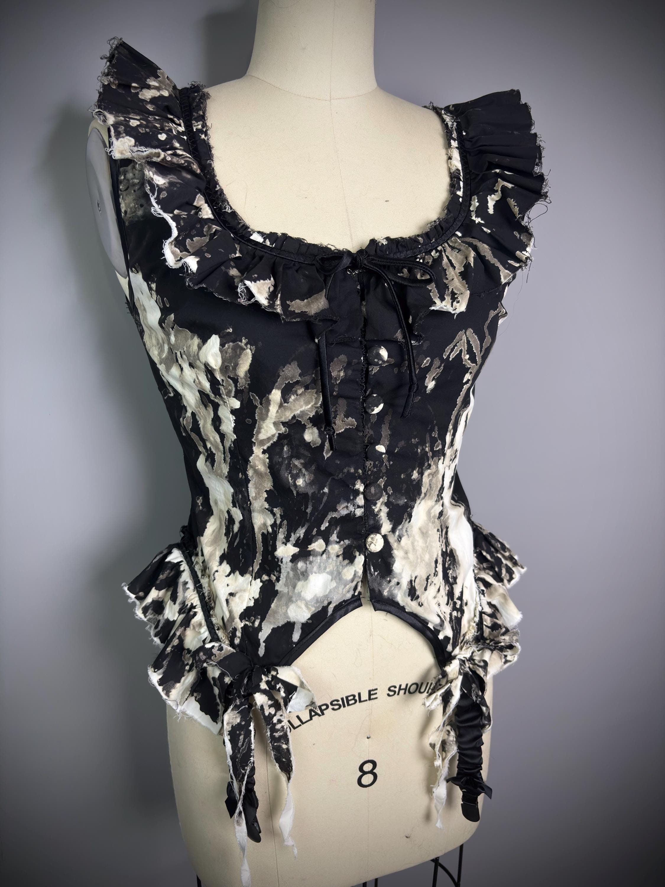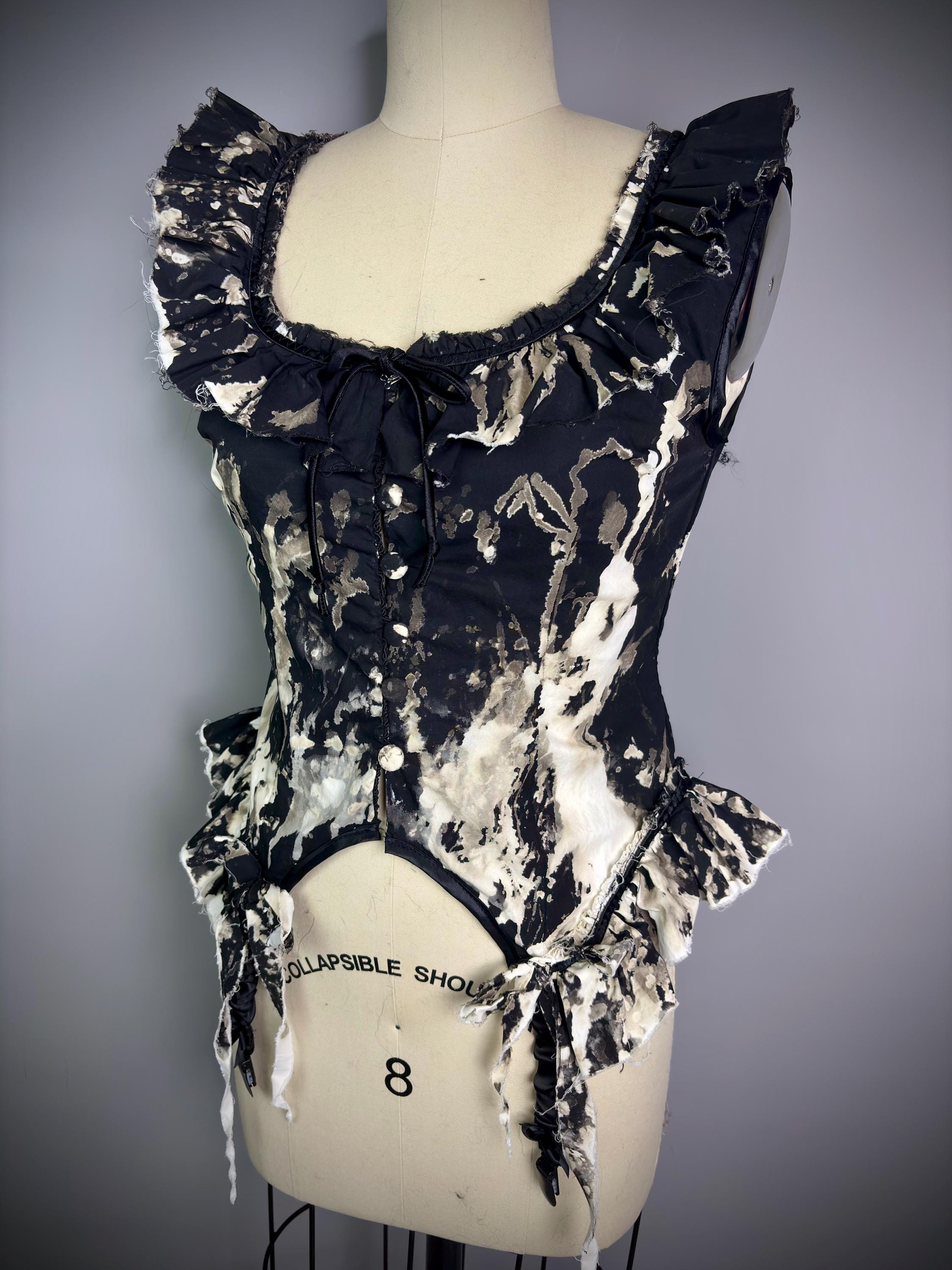 Black acid washed cotton milk made top with raw edged ruffles, covered button closure and satin garter straps.One of a kind.Size Small-mediumBust 34-36"Waist 27-28"Underarm to hem at side seam 11”