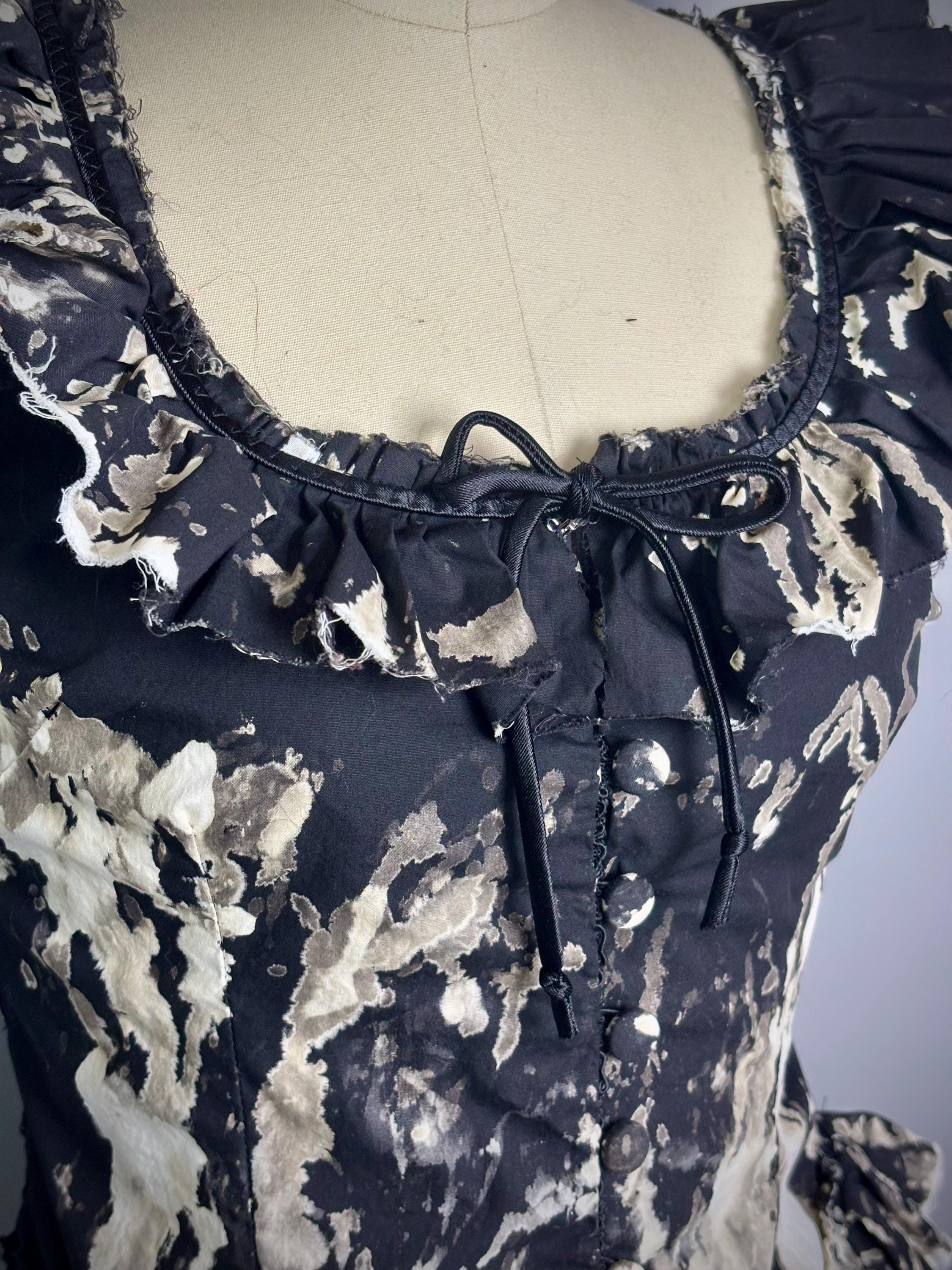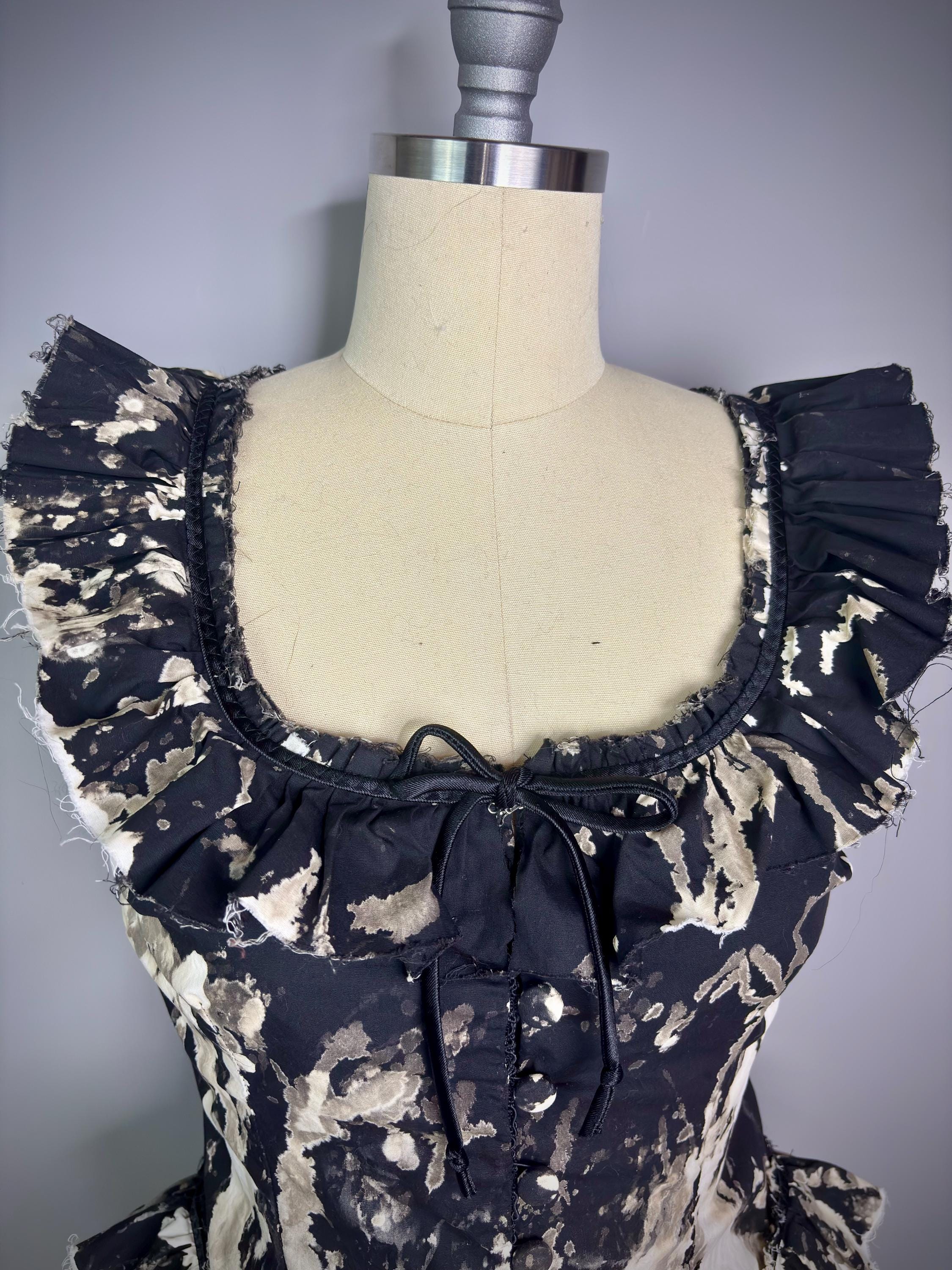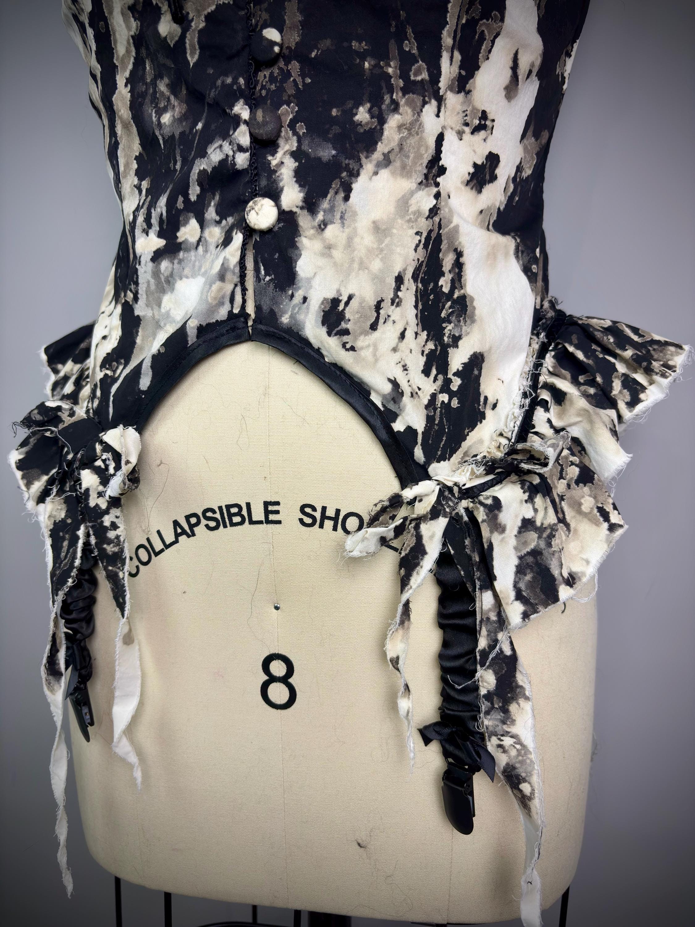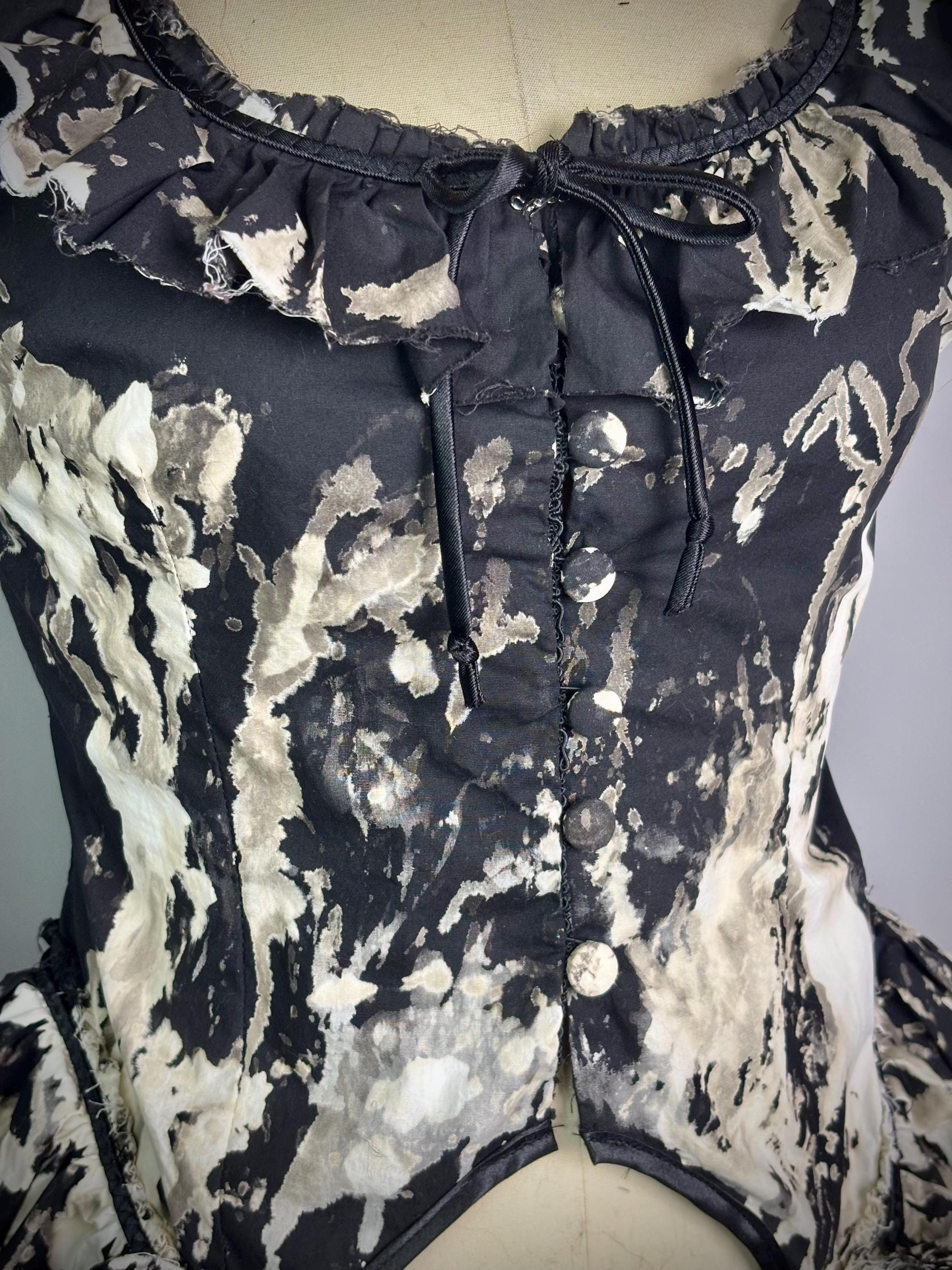 Black acid washed cotton milk made top with raw edged ruffles, covered button closure and satin garter straps.One of a kind.Size Small-mediumBust 34-36"Waist 27-28"Underarm to hem at side seam 11”