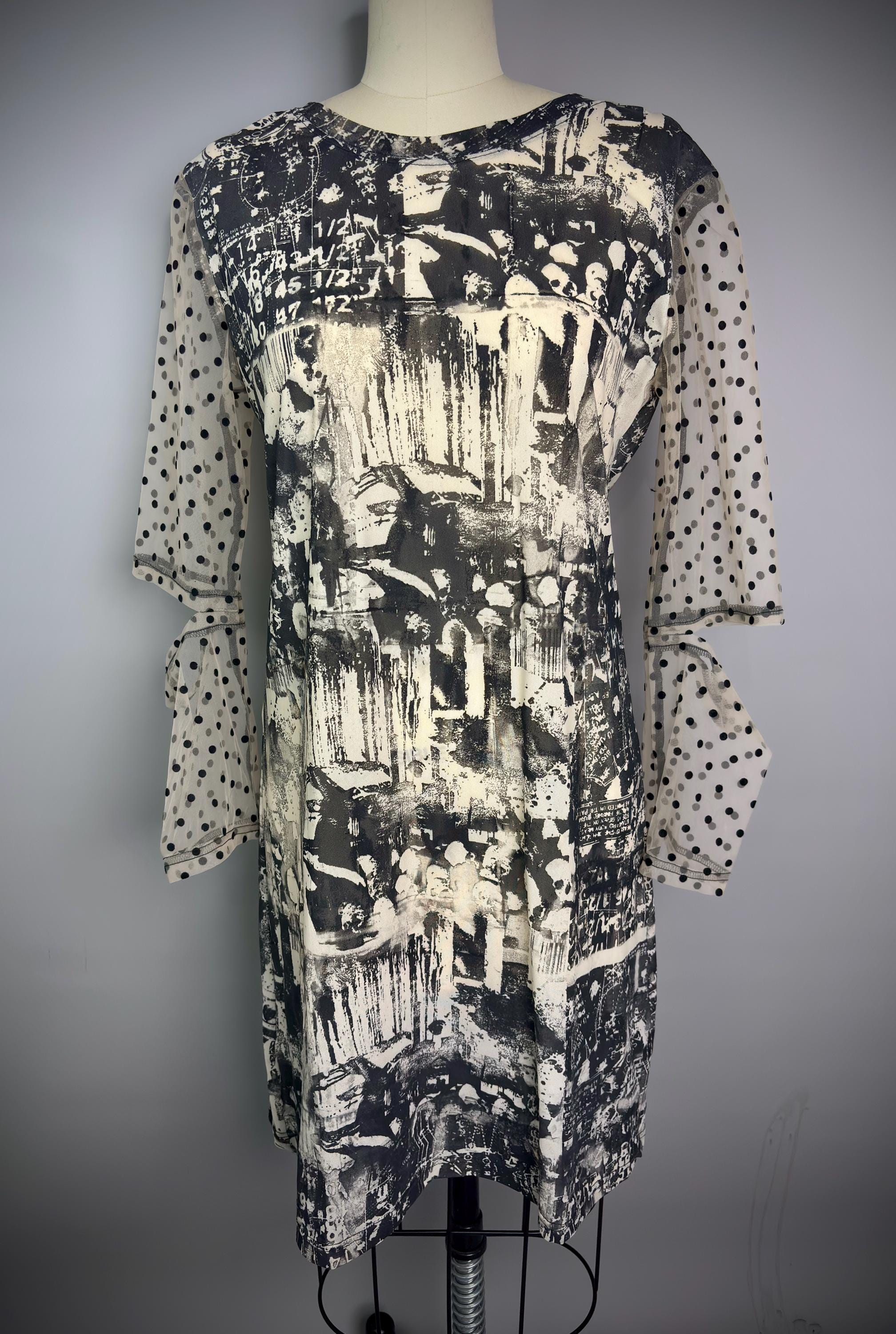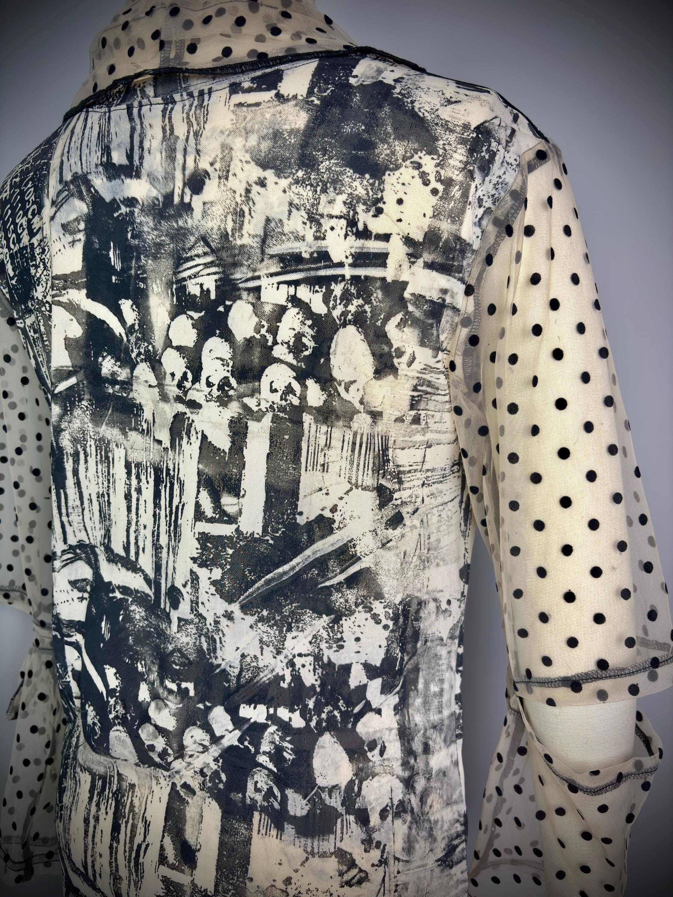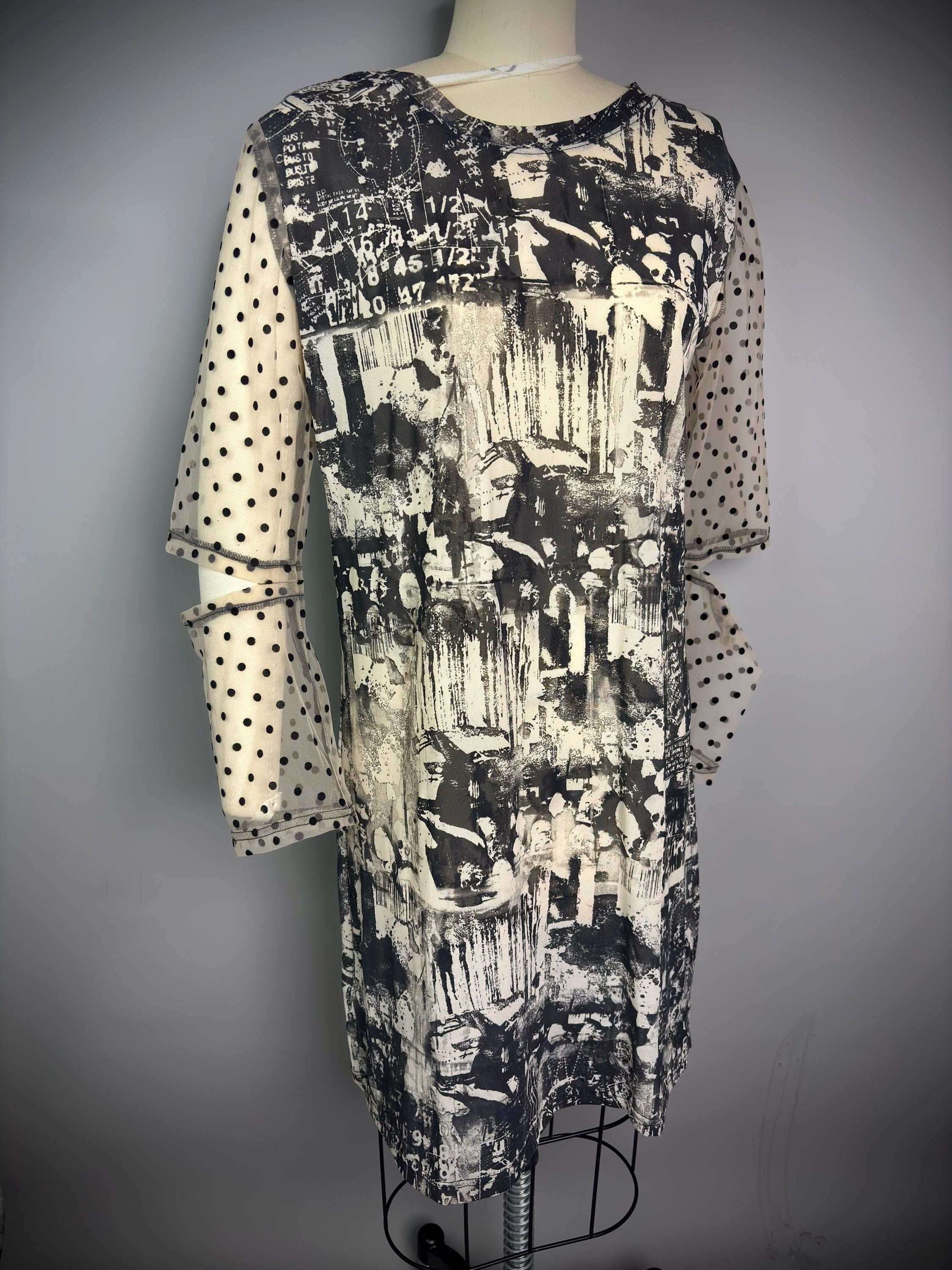RagLuxe handprinted mesh dress with unique pattern piece/skull print dress with polkadot cut out sleeves and removable/optional cowl neck scarf.