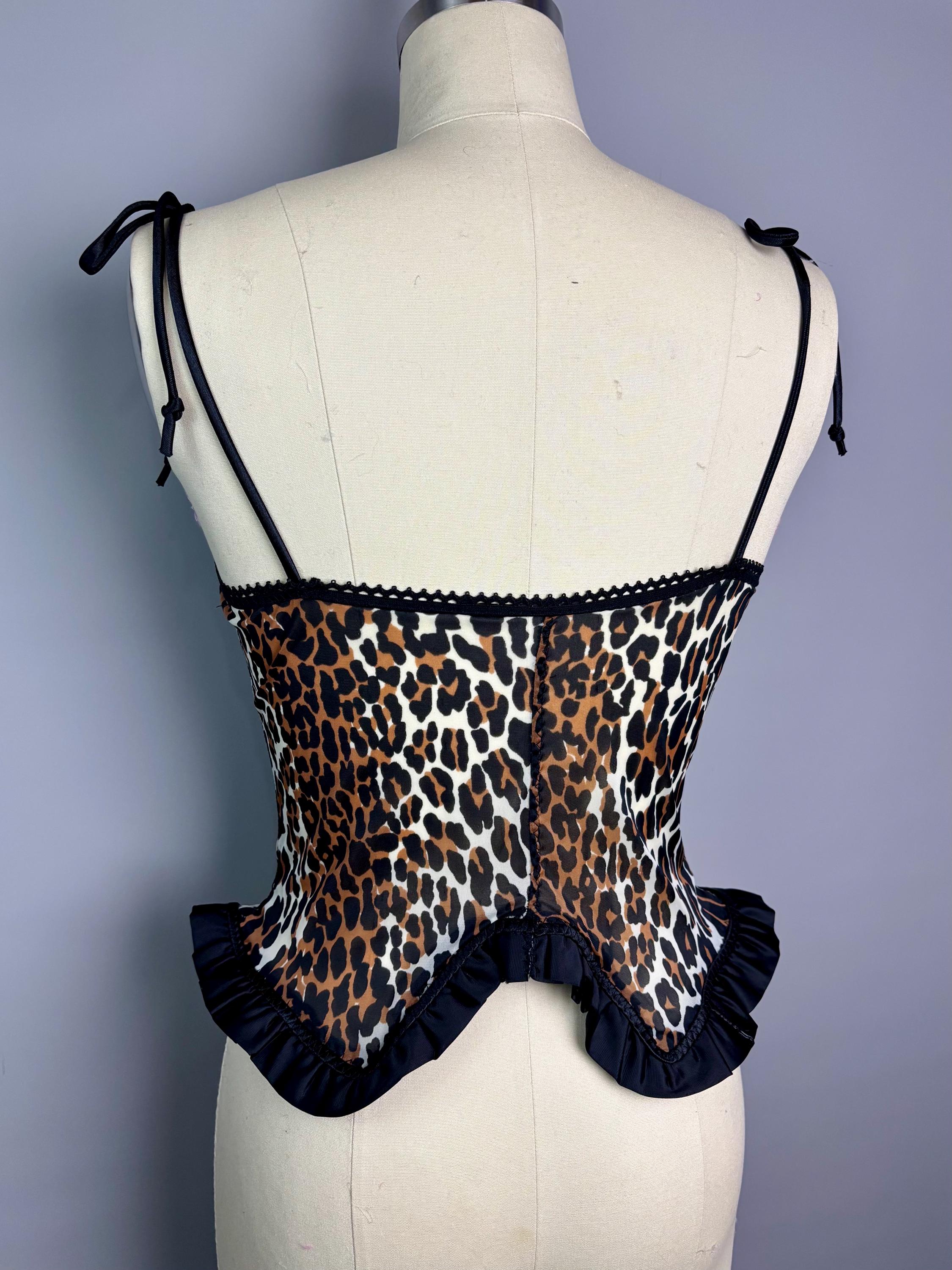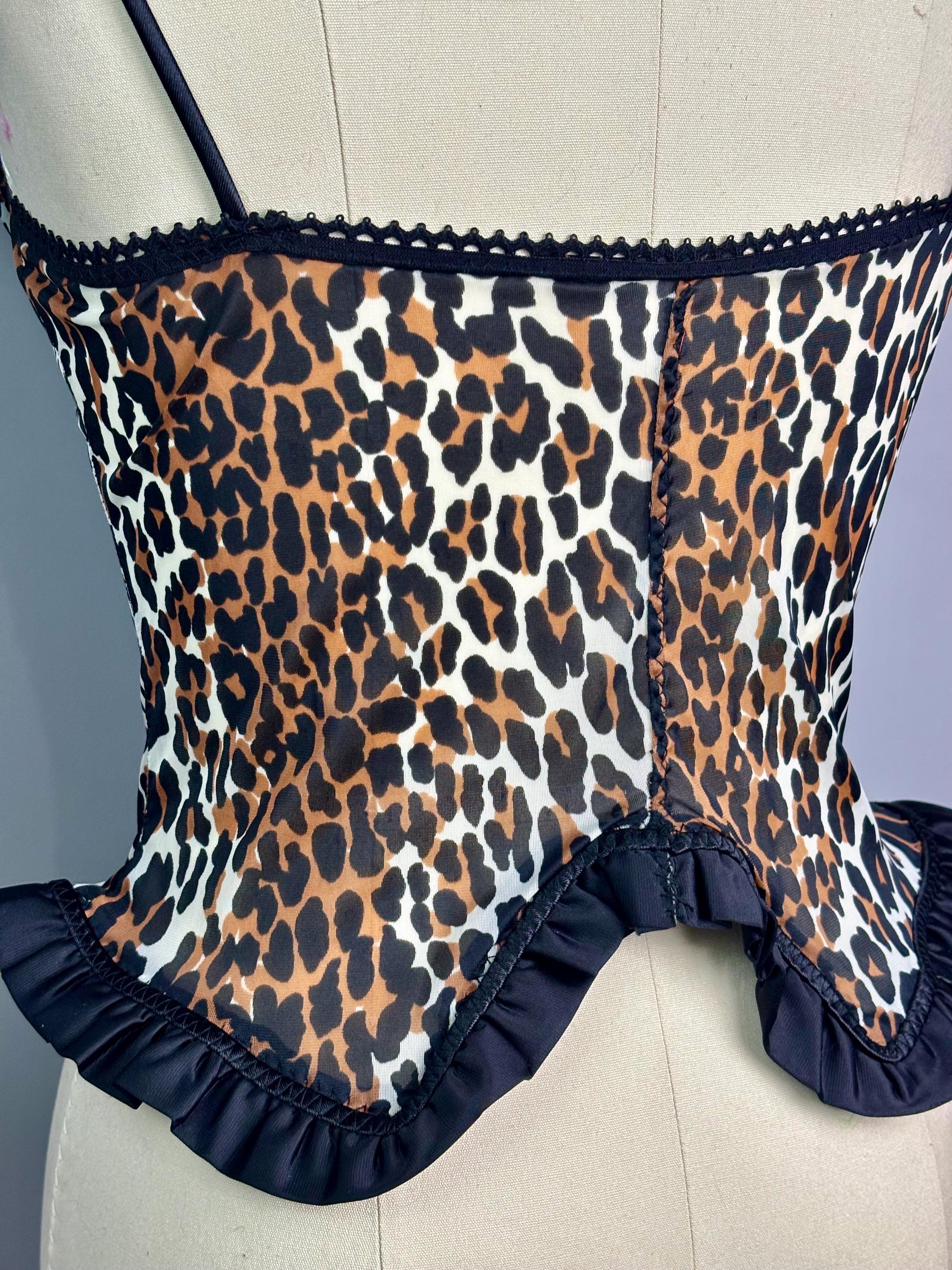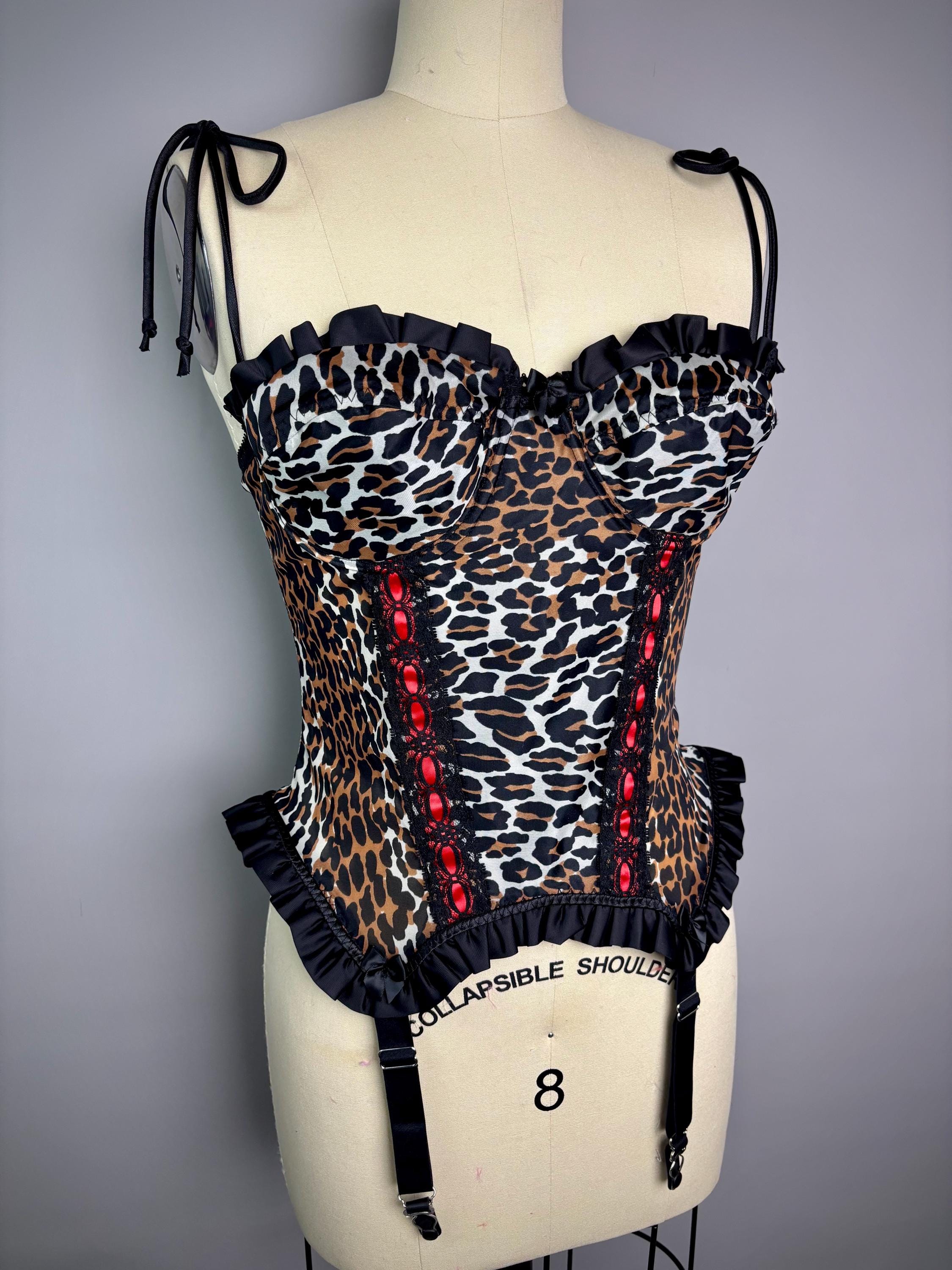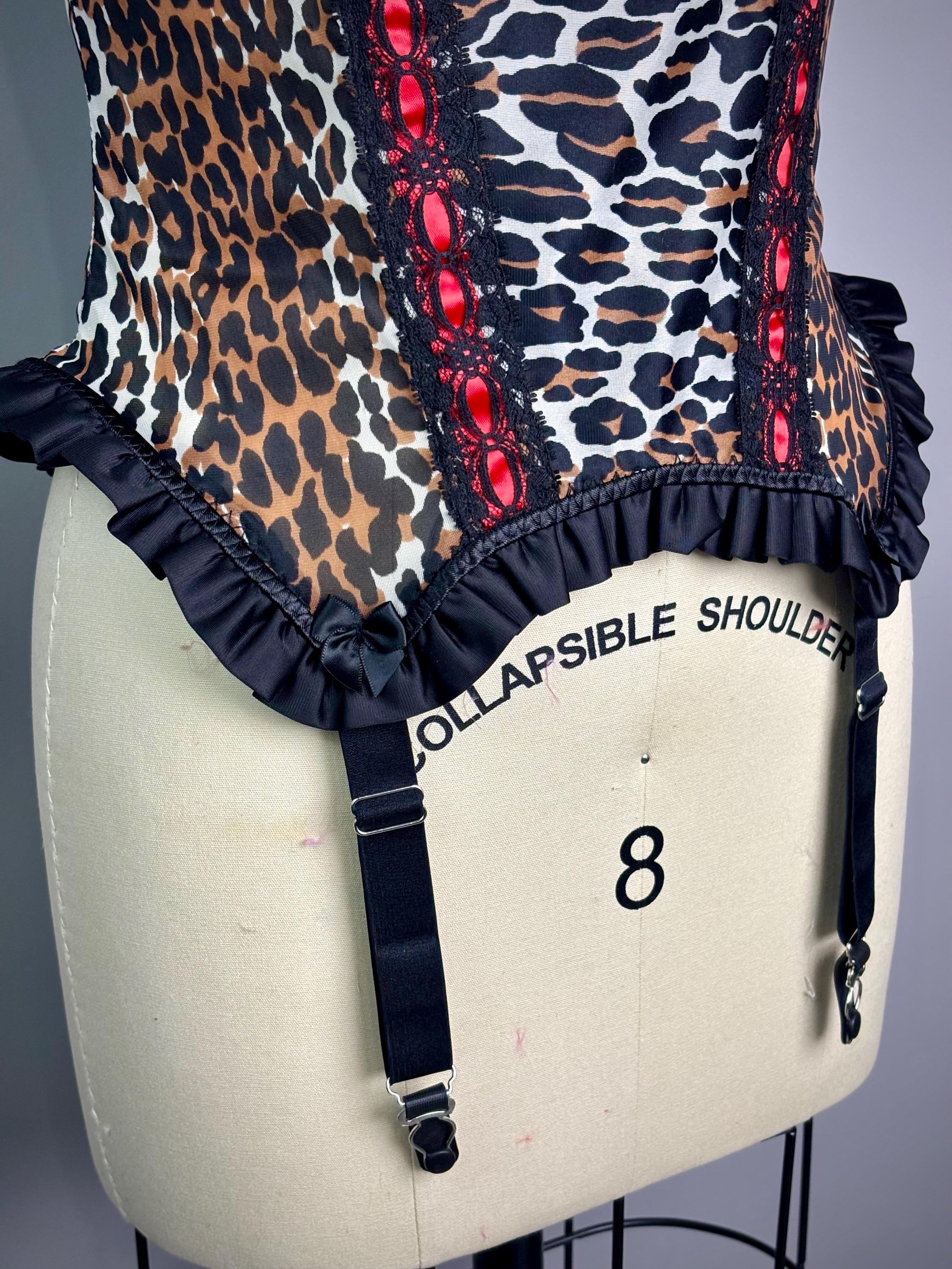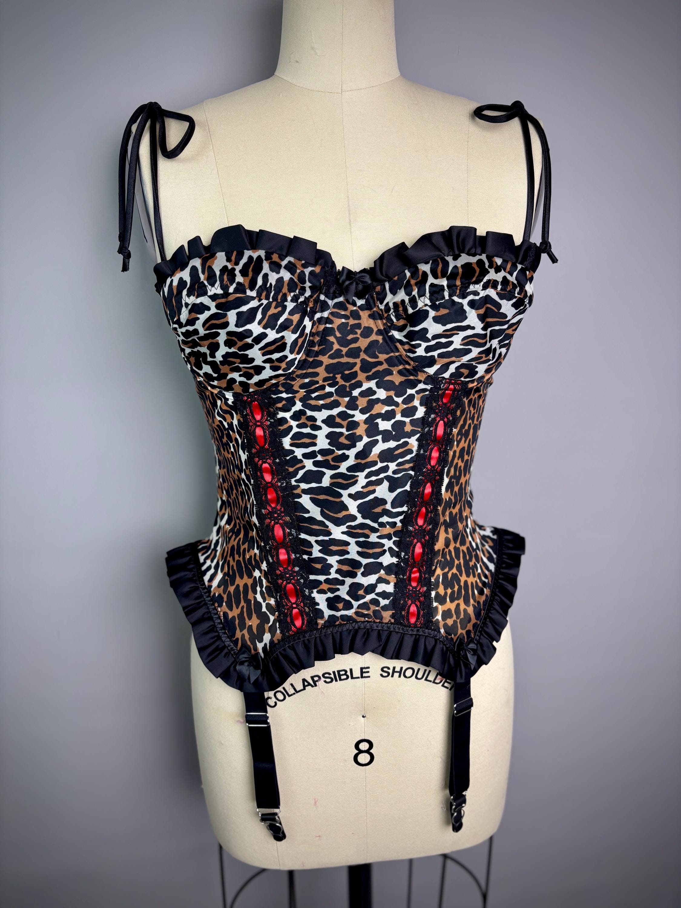 RagLuxe nylon bustier made from scratch using vintage Vanity Fair leopard. Top is has black satin ruffles trim and black metal garter clasps. Cup has underwire, roughly a 34 B/C.
